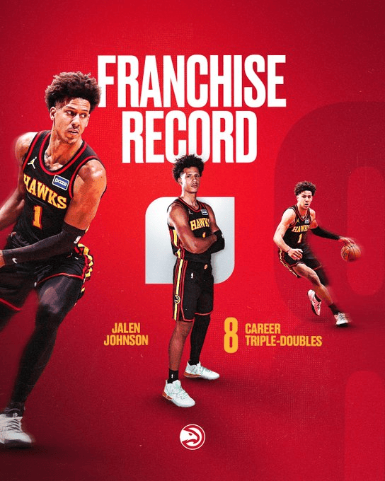 此役,杰伦-约翰逊得到12分10篮板12助攻,连续四场得到三双,得到生涯的第八次三双。