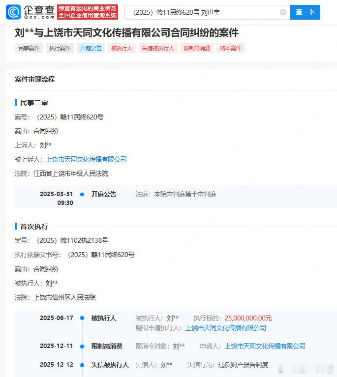 MLXG成老赖!天眼查天眼风险信息显示,近日,刘世宇(MLXG)被限制高消费,同时因违反财产报告制度,被上饶市信州区人民法院列为失信被执行人(老赖)。案件流程信息显示,此前,刘世宇已因此案被执行2500万元。