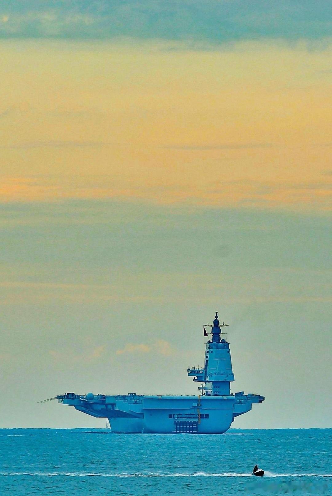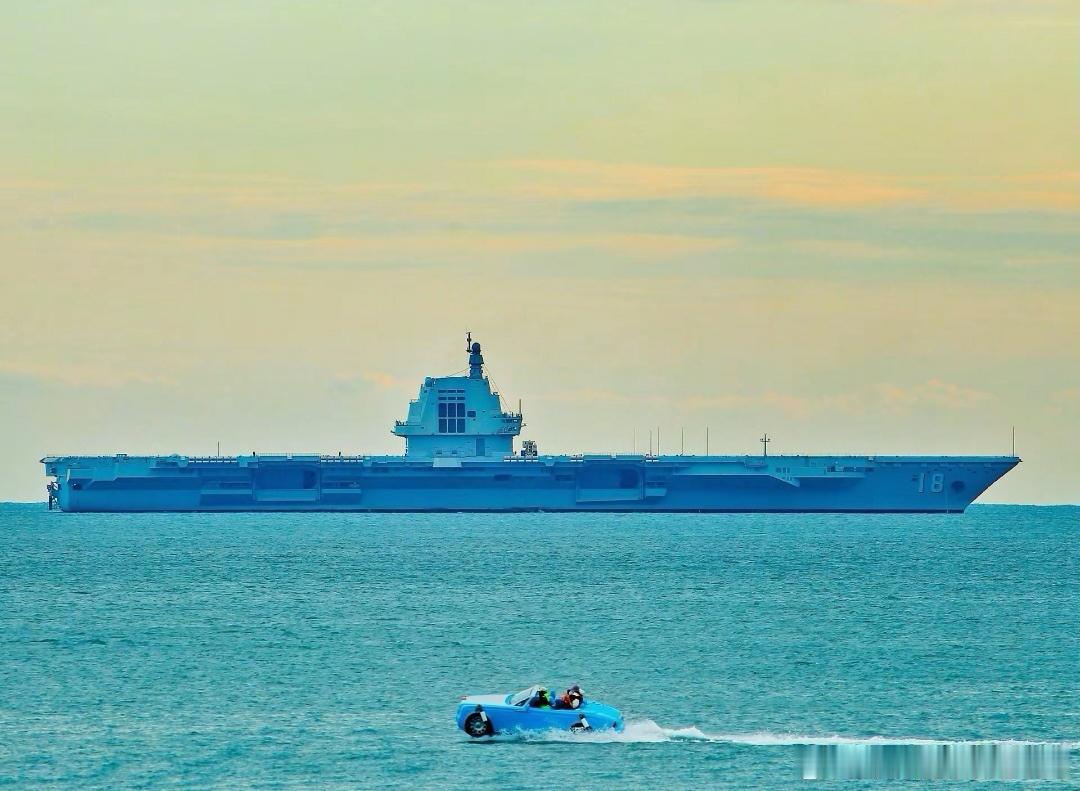 福建舰再次出海训练,缓缓驶出三亚军港,照片前景是在三亚海滨景区游玩的快艇,这一次