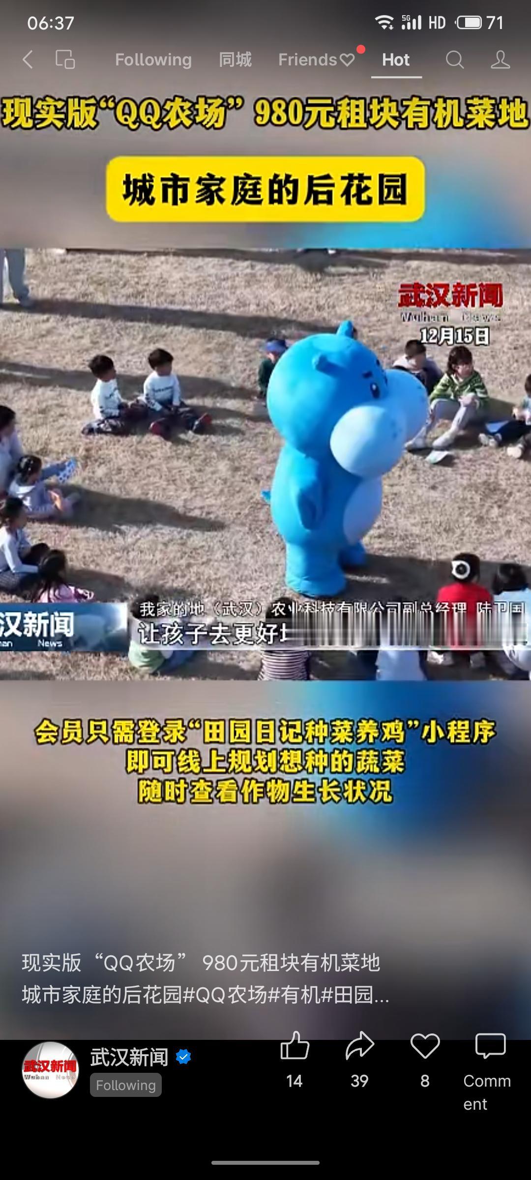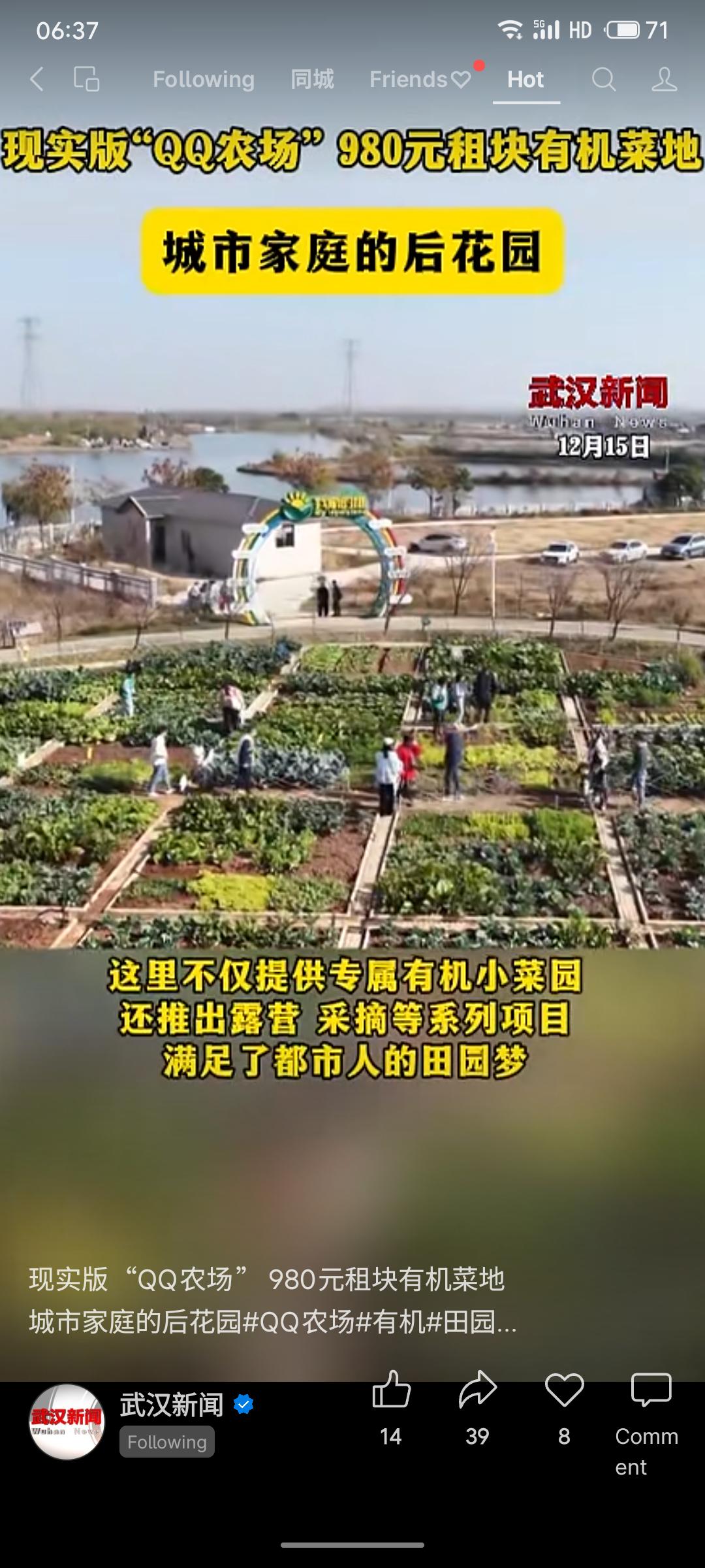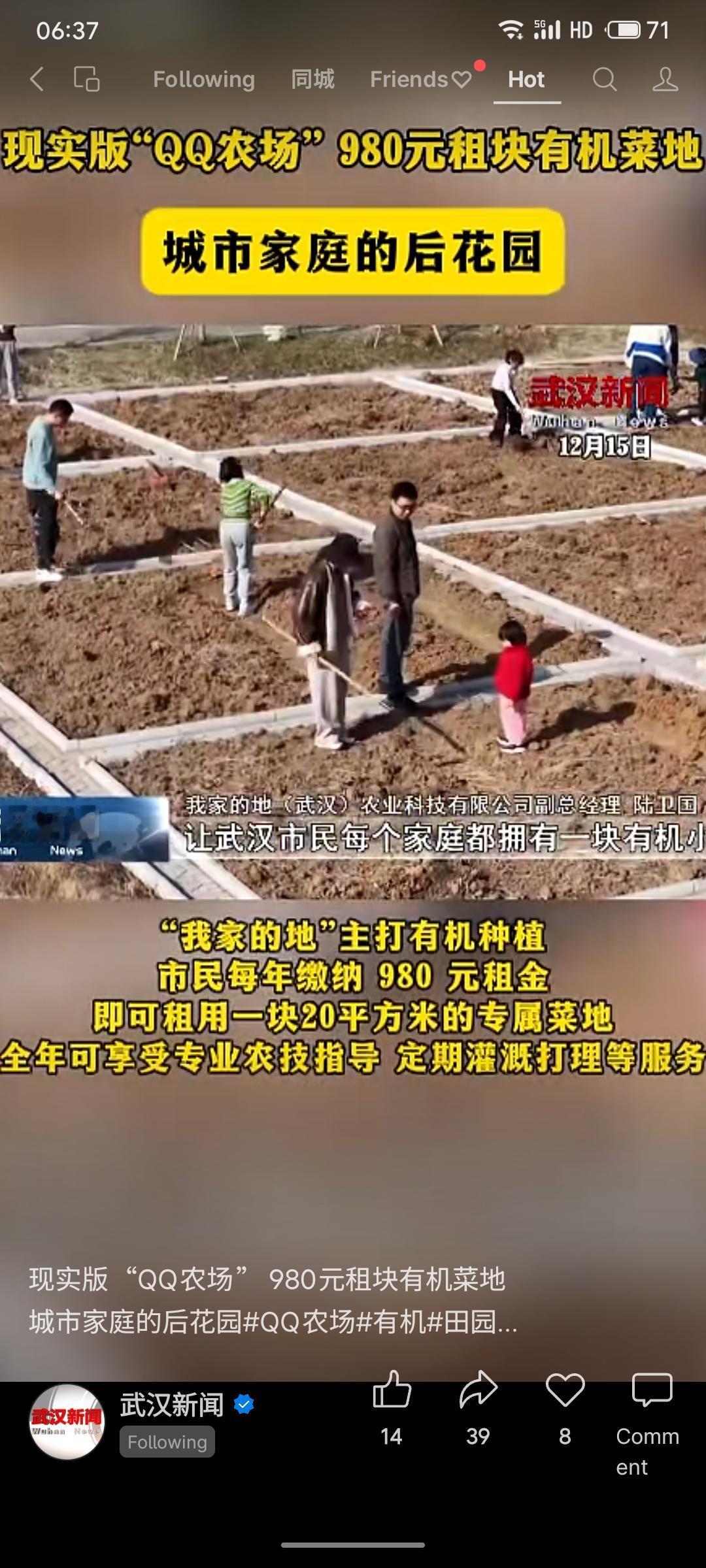 武汉推出“现实版QQ农场”:市民年付980元可租用20平米有机菜地,享受专业种植指导与托管服务。该项目结合线上小程序管理与线下露营采摘,让城市家庭亲身参与农耕,既满足了都市人的田园情怀,也为有机农业与休闲体验的创新融合提供了可行样本。
