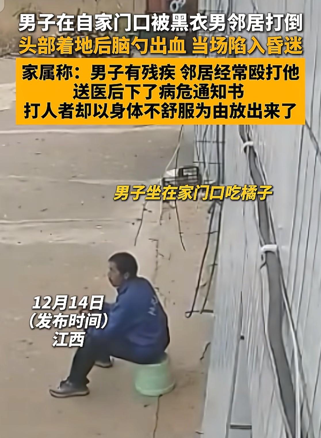 太嚣张!一句口角竟挥拳打昏邻居,51岁男子脑出血病危,调解协议成废纸! 邻里纠纷明明已握手言和,却因一言不合重拳相向,让一条人命危在旦夕!这一拳打碎的不仅是受害者的健康,更是邻里相处的底线与法治的尊严! 据极目新闻报道,12月15日网友曝光监控视频,江西宜春宜丰县方溪镇一名51岁男子,因半个月前的养狗纠纷,被邻居一拳打倒在地致脑出血,医院下达病危通知书。 此前双方的纠纷经派出所调解已了结,却不料对方突然发难。一句口角、一次冲动,就酿成了可能毁掉两个家庭的悲剧。邻里之间本应守望相助,些许摩擦更该理性化解,而不是用拳头代替沟通。 镇政府与派出所已介入处理,但此事更该警醒所有人:冲动是魔鬼,法治社会里,任何矛盾都不能成为暴力伤人的借口,逞一时之勇,终将付出法律的沉重代价。