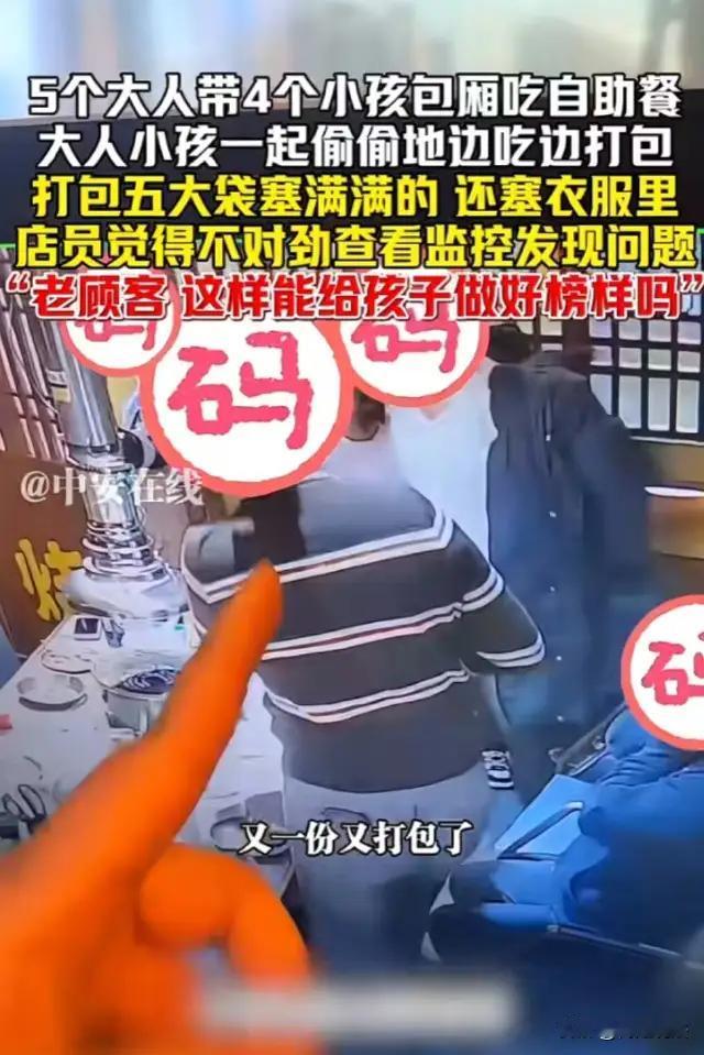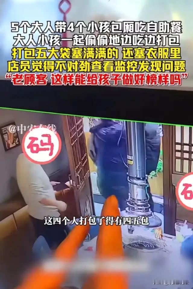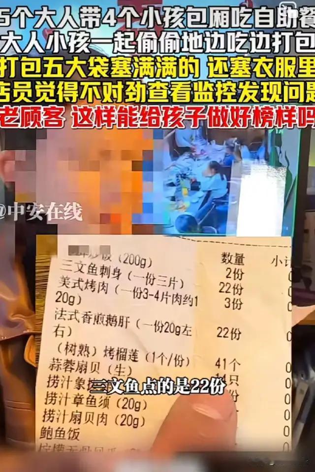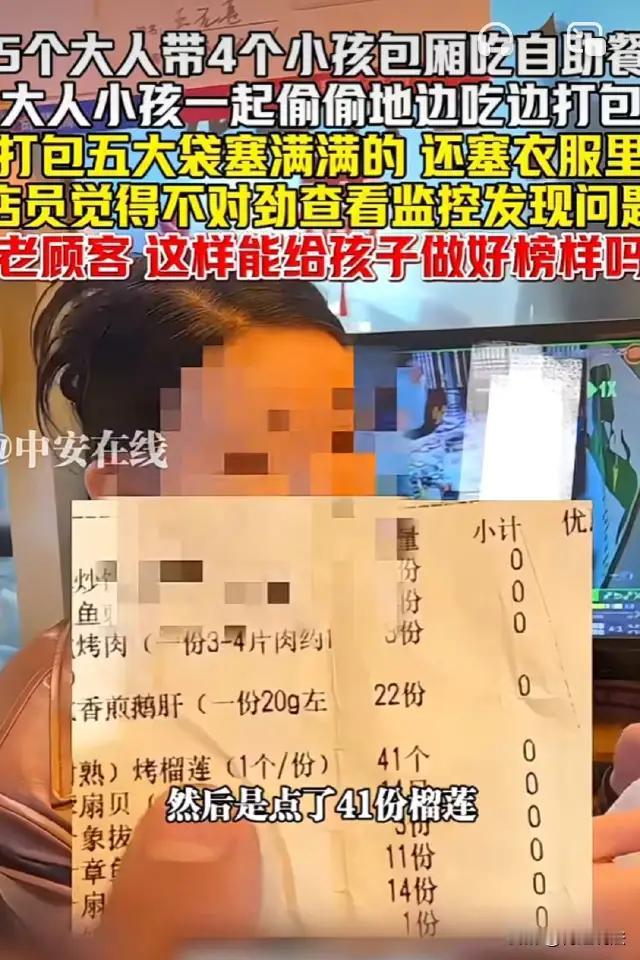 9人吃自助狂拿41份榴莲还偷打包五大袋,贪小利失德行引众怒 乌鲁木齐一家自助餐厅内,5名大人带着4名孩子前来就餐,本是一场寻常的聚餐,却演变成了一场令人咋舌的“薅羊毛”闹剧。 店员在核对菜品消耗时察觉异常:这桌客人单单榴莲就点了41份,海鲜、肉类更是每份都以十份为起点下单,远超正常就餐的食量。心存疑虑的店员调取监控后,真相让人大跌眼镜——这9人根本不是单纯就餐,而是一边大快朵颐,一边偷偷将大量未吃完的榴莲果肉、海鲜、肉类等食材打包,最后竟带走了满满五大袋子。 自助餐厅本是“按量取食、杜绝浪费”的消费模式,靠的是消费者的自觉与诚信。这家人的行为,不仅严重违背了自助餐的消费规则,更是赤裸裸的贪小便宜、浪费食材之举。事件曝光后,网友纷纷谴责这种“吃不了兜着走”的不道德行为,直言“占便宜没够,丢了做人的体面”。目前,餐厅已就此事与涉事顾客沟通,后续处理结果尚未公布。 餐桌文明彰显个人德行,按需取餐、文明就餐才是应有之义,切莫因一时贪念,失了品行丢了脸面。 素材取于网络,侵权删除。