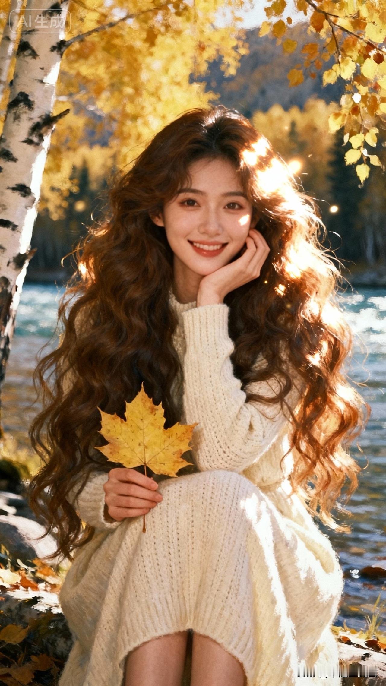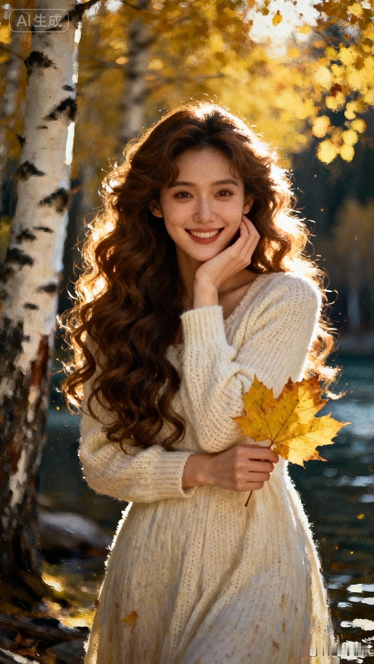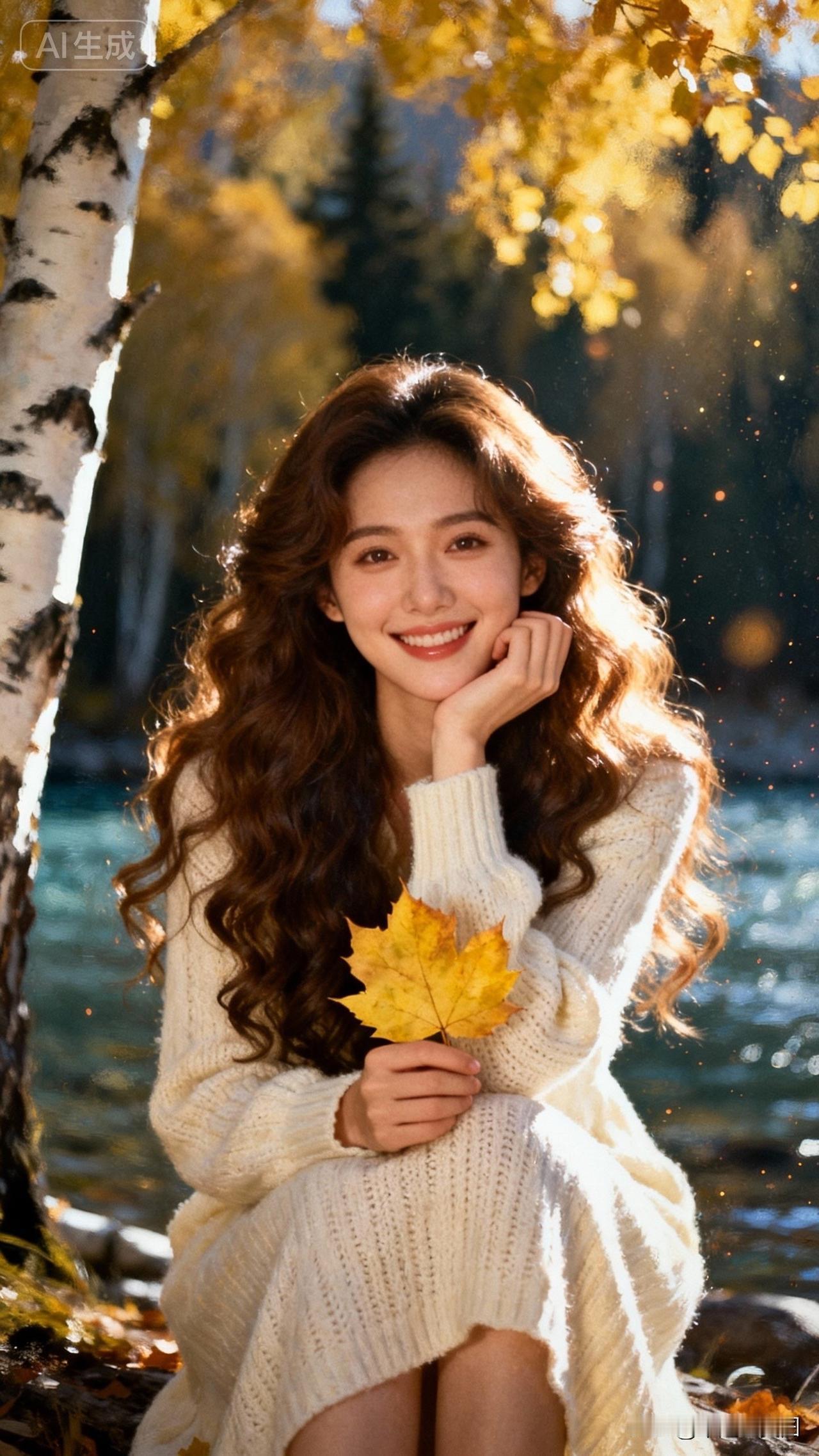秋日暖阳下,微笑的少女与落叶共舞
