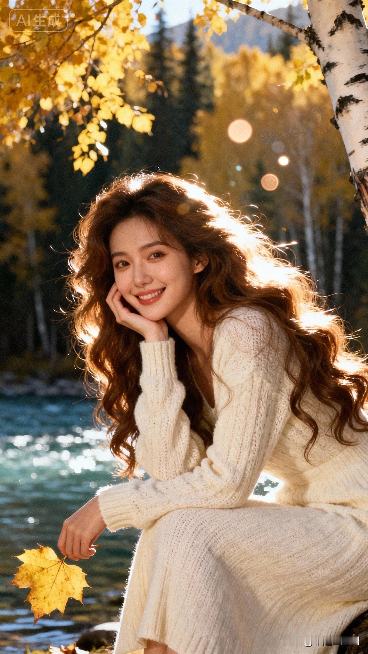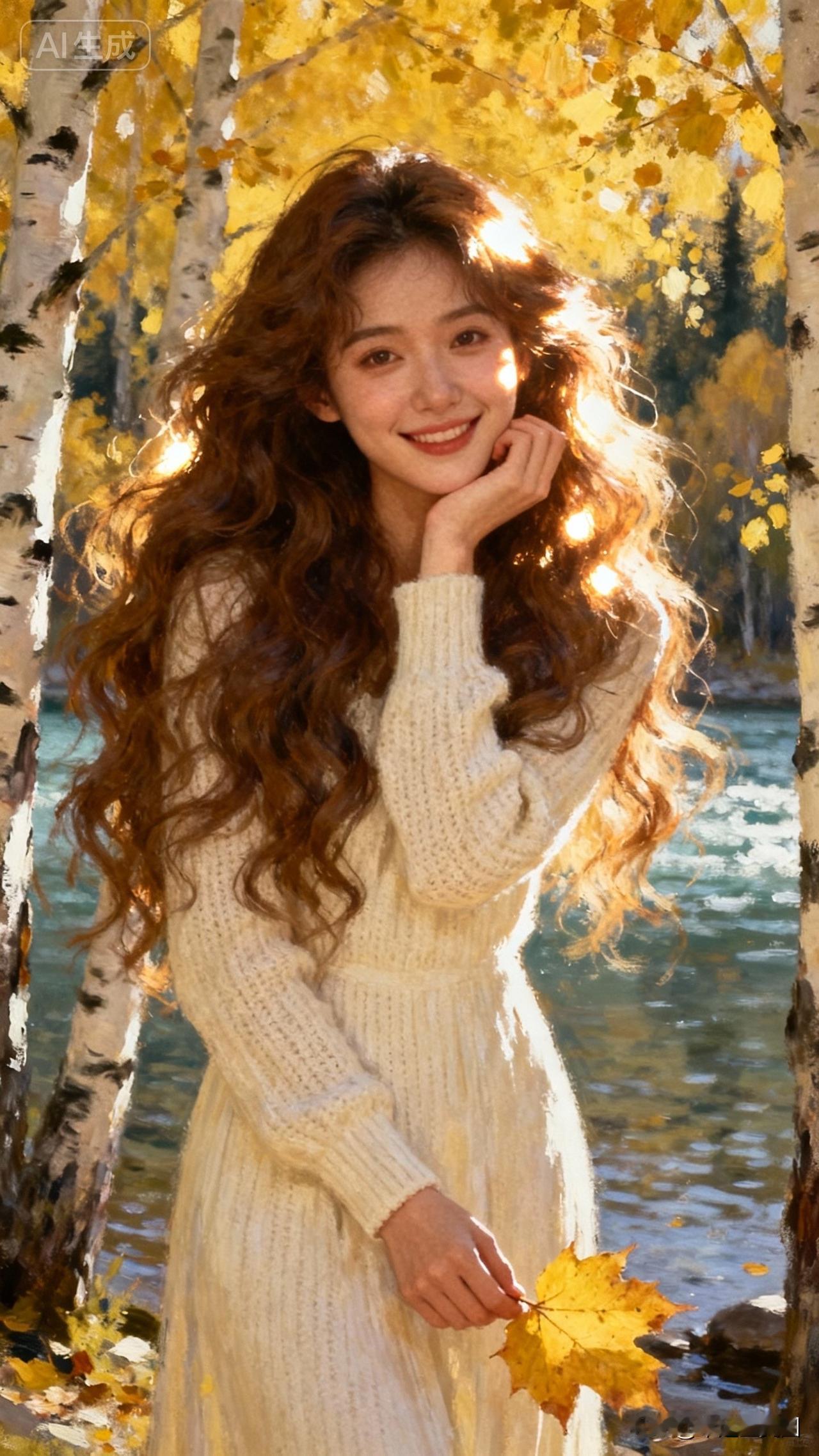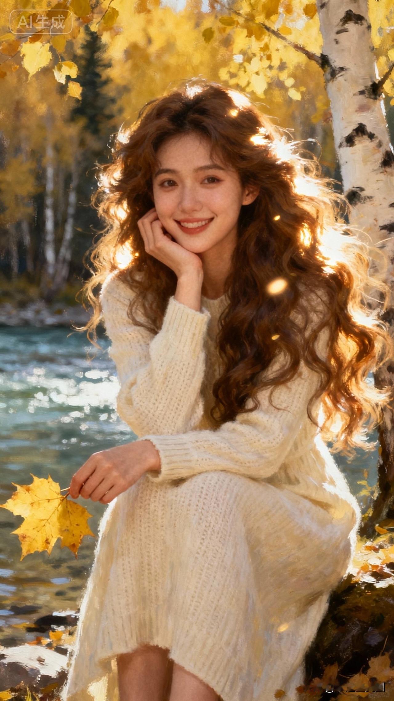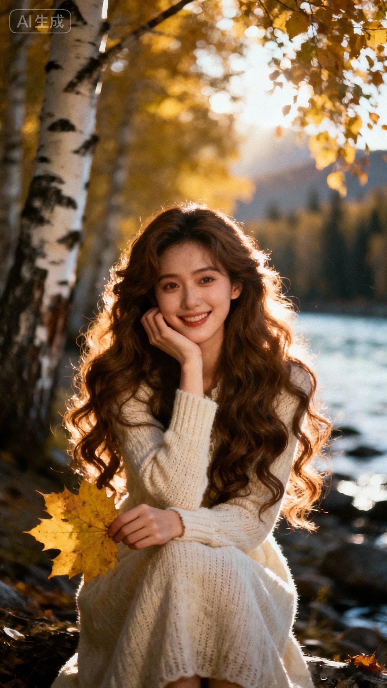 秋日暖阳下,微笑的少女与落叶共舞