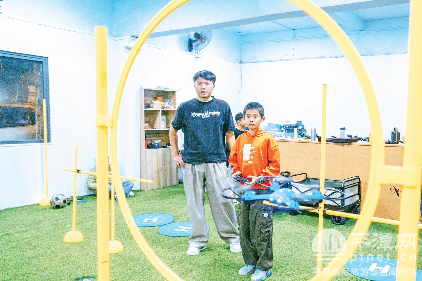 教练陈友峰(左)指导方天逸操控无人机穿越障碍物。