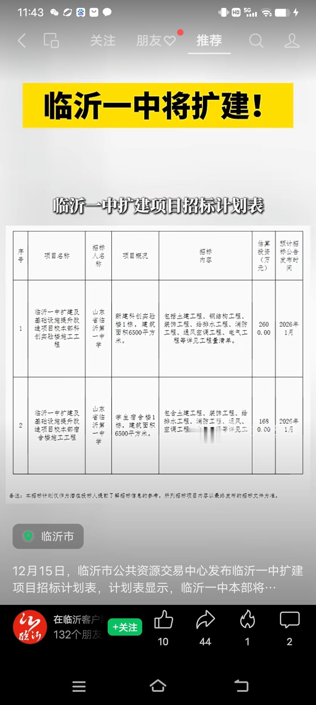 最新!临沂一中(本部)迎来好消息,即将新建两个大楼,其中一个是宿舍楼,这样可以大大缓解一中学生的住宿压力,提高学生的住宿体验感,舒适度。期待临沂一中(本部)越来越好。欢迎大家留言文明交流!