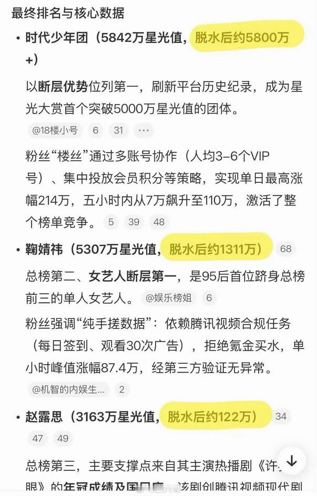 星光大赏星光值最终脱水数据啊这,这是啥情况啊,就是说星光大赏的星光值第一轮脱水后,鞠婧祎排在第一位。但是现在又出来一版最终脱水数据。时代少年团断层领先星光值,就是说顶流团的含金量还在上升啊”星光大赏艺人脱水后有效值