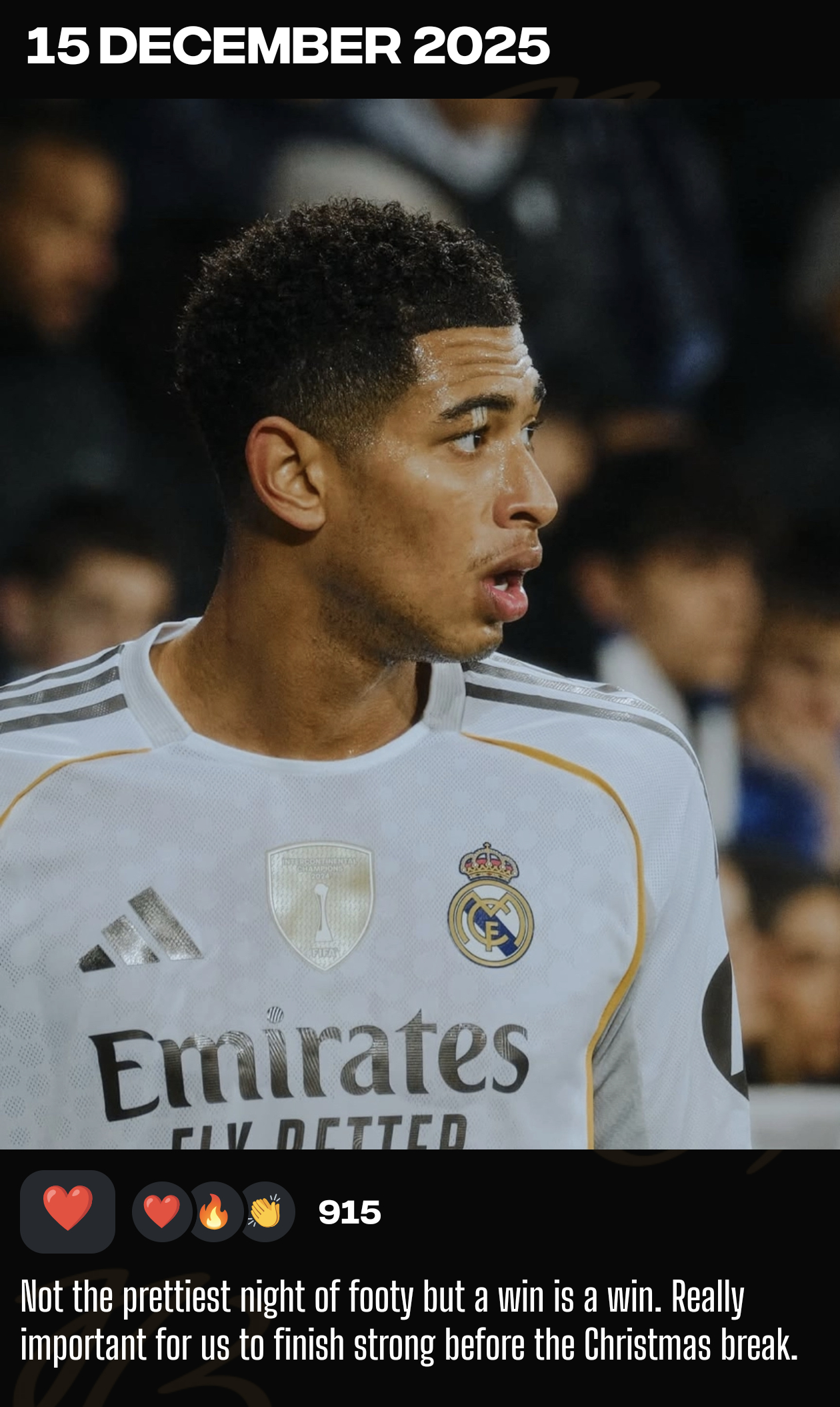 APP更新两则不是最完美的足球之夜,但三分就是三分。在圣诞假期前强势收官对我们至关重要。有着三分的周一总是更美好。祝大家度过愉快的一周!🤍阿拉维斯vs皇马