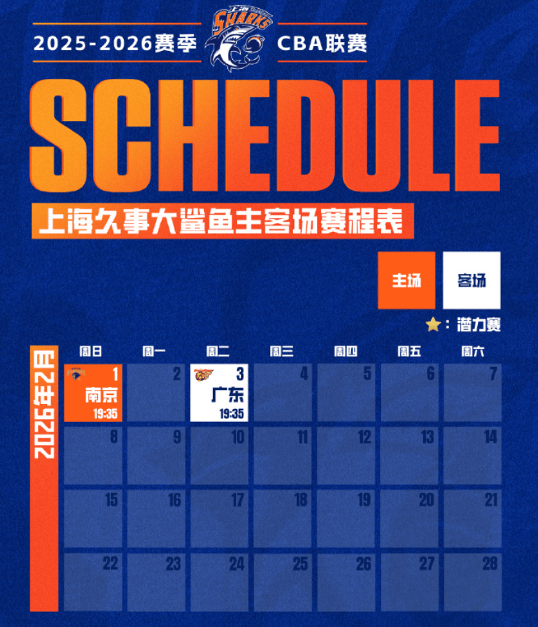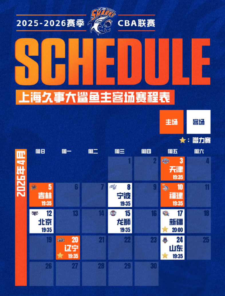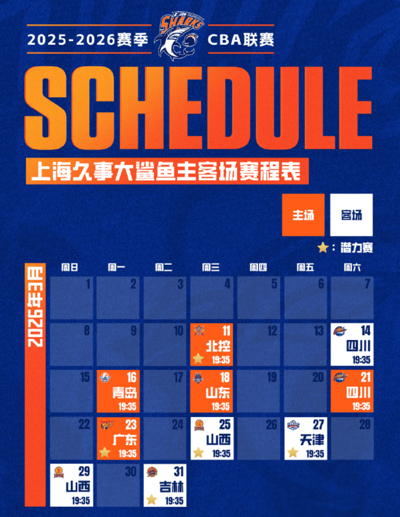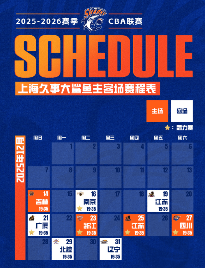 “上海久事男篮2025-2026赛季常规赛赛程表,请查收!
