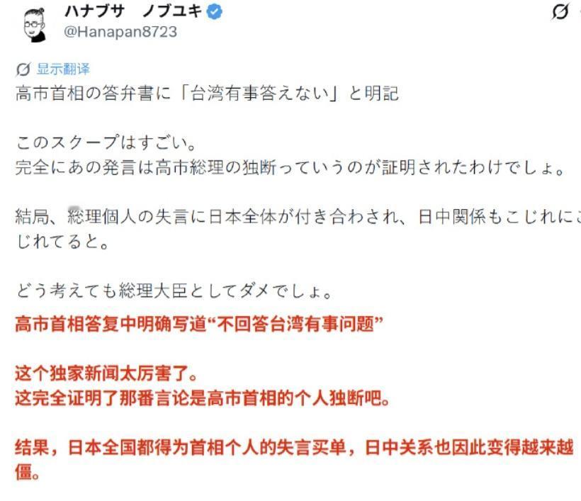 日本主流媒体纷纷曝光,称高市早苗闯祸的那句话,是她自己说漏了嘴! 最近几天,日本多家主流媒体不约而同聚焦一个细节:11月7日国会答辩中,高市早苗那句引发争议的发言,并不是照本宣科,而是“即兴发挥”——也就是说,是她自己说漏了嘴。 据报道,高市早苗当天面对的质询问题,其标准答案早已由官僚团队拟好。这份资料明确指示:“关于台海问题的假设性问题,不予回答。”换句话说,这不是一次开放讨论,而是一次需要严格遵循既有政策口径的例行答辩。 但高市在实际发言中却偏离了脚本。看来啊,现在日本的媒体纷纷找台阶下,说高市的发言并非出自官方统一口径,而是她个人的主张。显然,这可能是日本内部希望找补回来双方的关系。 毕竟,现在中方的一系列措施,让日本开始感到疼了。稀土进口受限了,水产品出口也没了,中方游客也不见了。 不少日本人很不满,认为日本全国都在为高市早苗的一句话买单。而且这句话是头脑发热之下,脱口而出的。这样的人,怎么适合做首相呢?