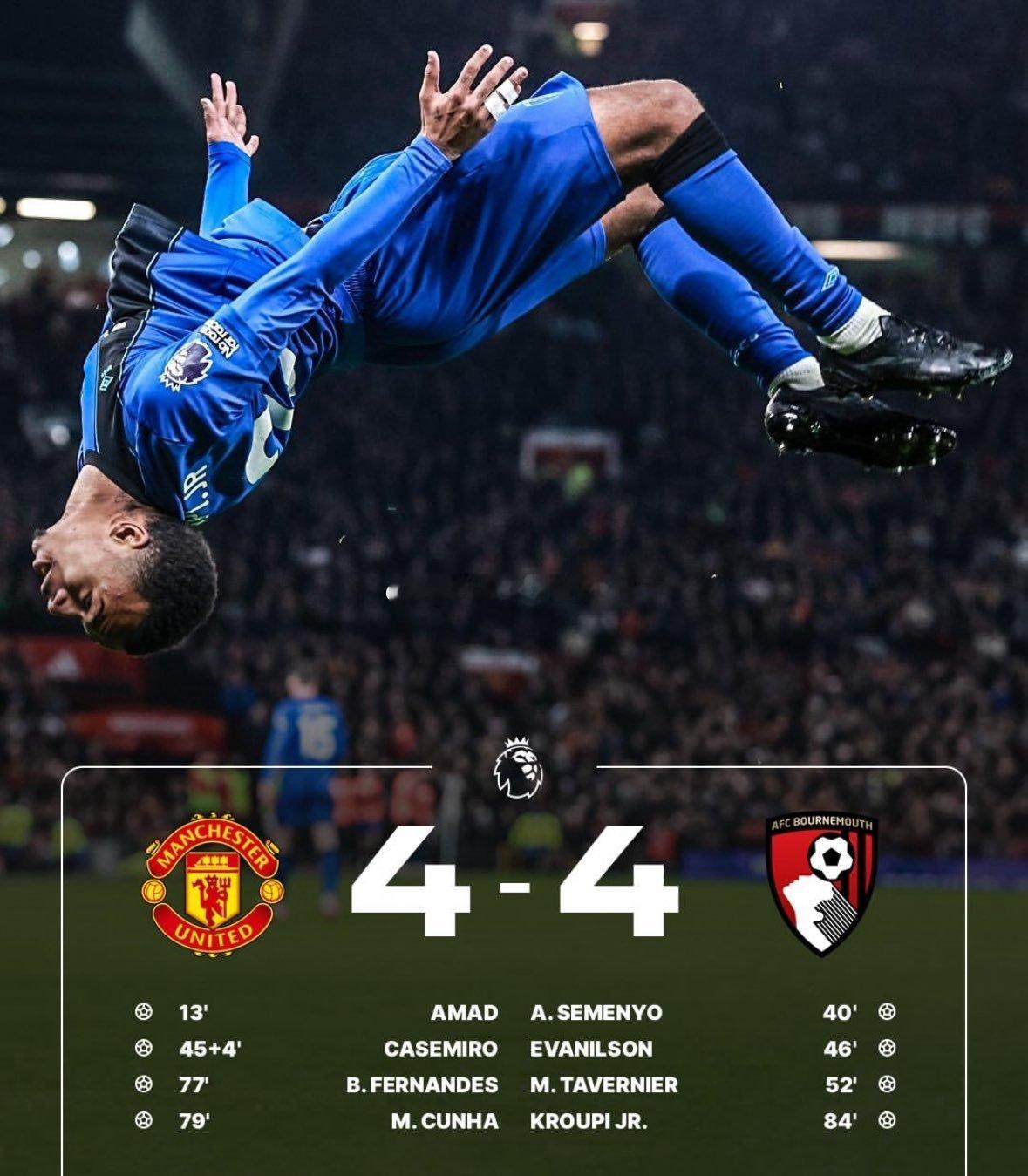 曼联4比4伯恩茅斯 曼联一到节日附近就是这种高流量的打法,伯恩茅斯客场8场比赛进15球,这场比赛踢之前7场进了11球,场均进球数根本不高,反而打豪门球队开始狂轰乱炸,这就证明阿莫林现在牺牲防守去强攻的战术还是问题很大,感觉后面的赛程曼联很难了,别阿莫林圣诞节之后下课了。