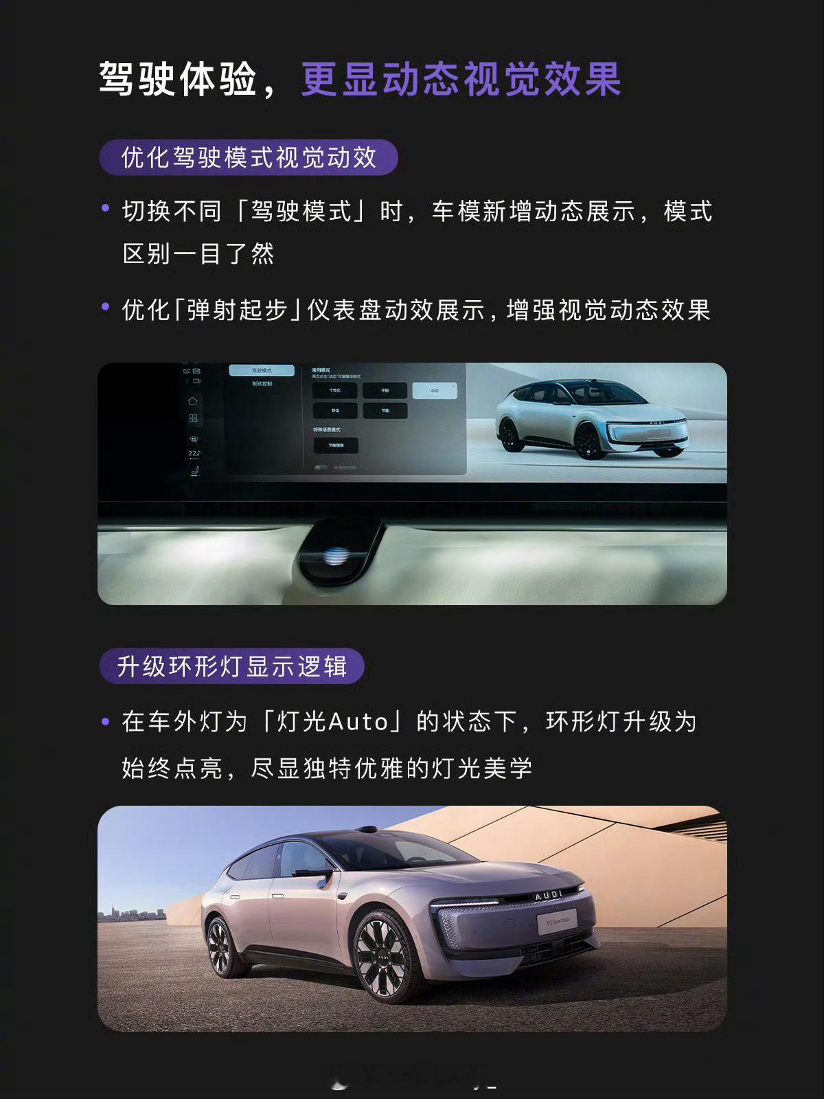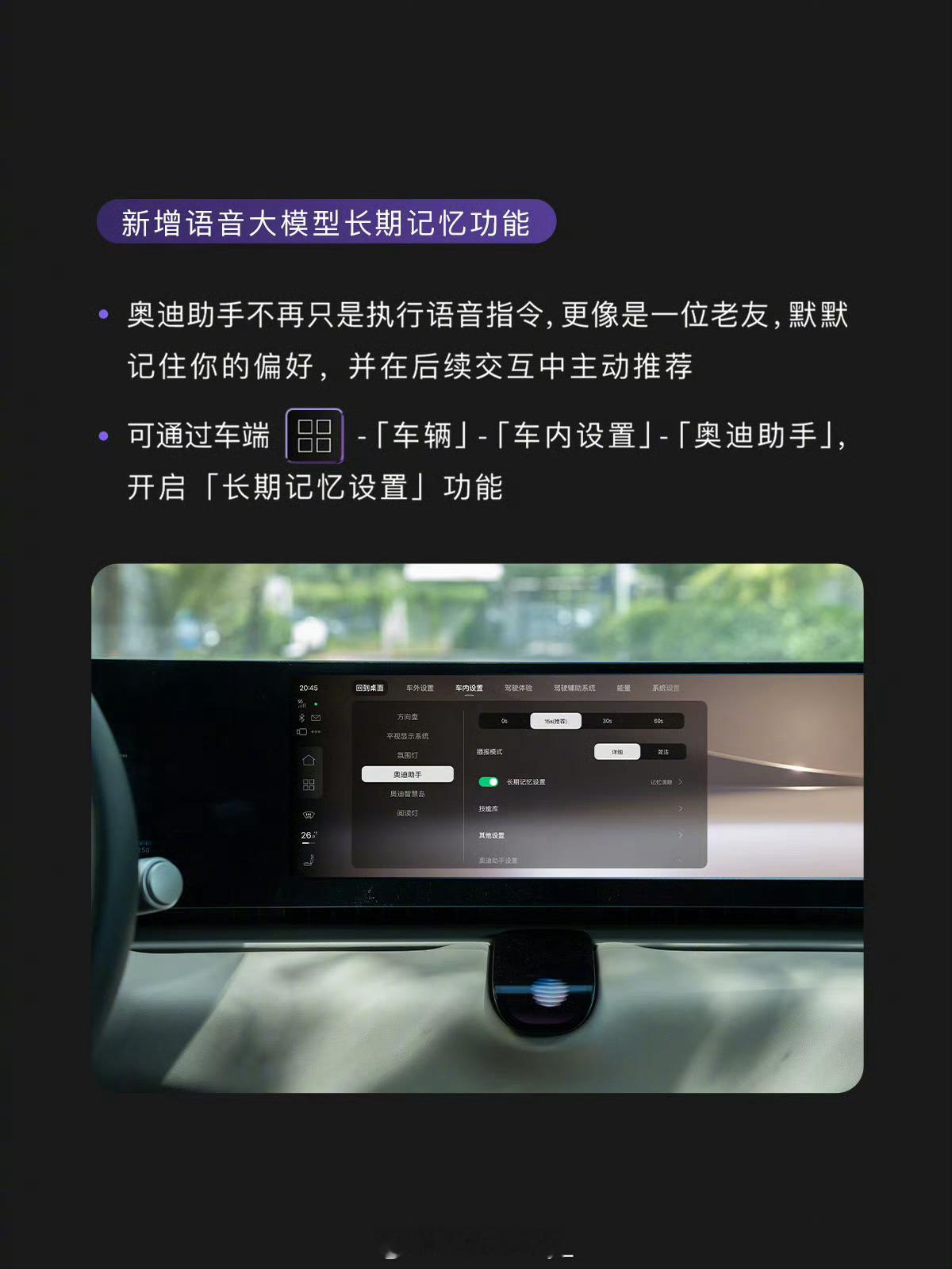 我的车今天好像有情绪了奥迪E5 Sportback迎来首次OTA升级,带来视觉交互、副驾协同等多重盛宴:播放音乐时屏幕呈现唱片动效,开启香氛即绽放花朵与香水动画,多达35种奥迪助手动画,每次交互都充满仪式感,还新增了“长期记忆”功能,持续学习用户偏好,做真正的贴心助手;副驾屏幕新增独立地图入口,乘客搜索地点可一键同步至中控,更加适配中国家庭出行场景。后续OTA将强化驾驶智能体验,逐步上线车辆状态主动提醒、交互细节优化等功能,同时迭代辅助驾驶系统模型。大v聊车AUDI迎来大规模OTA