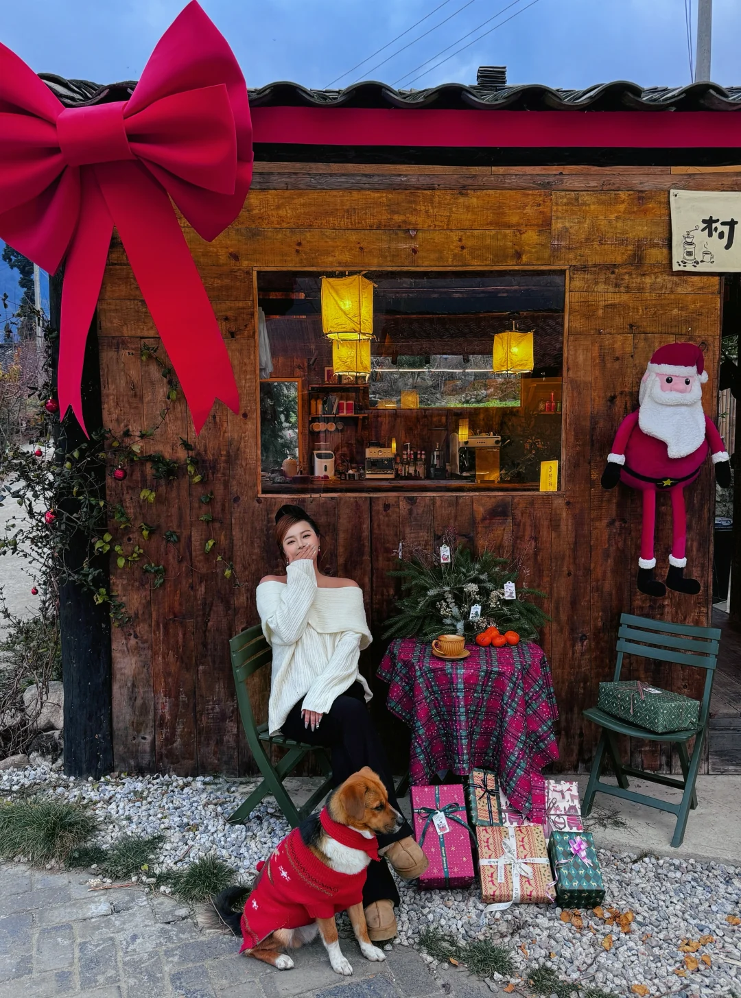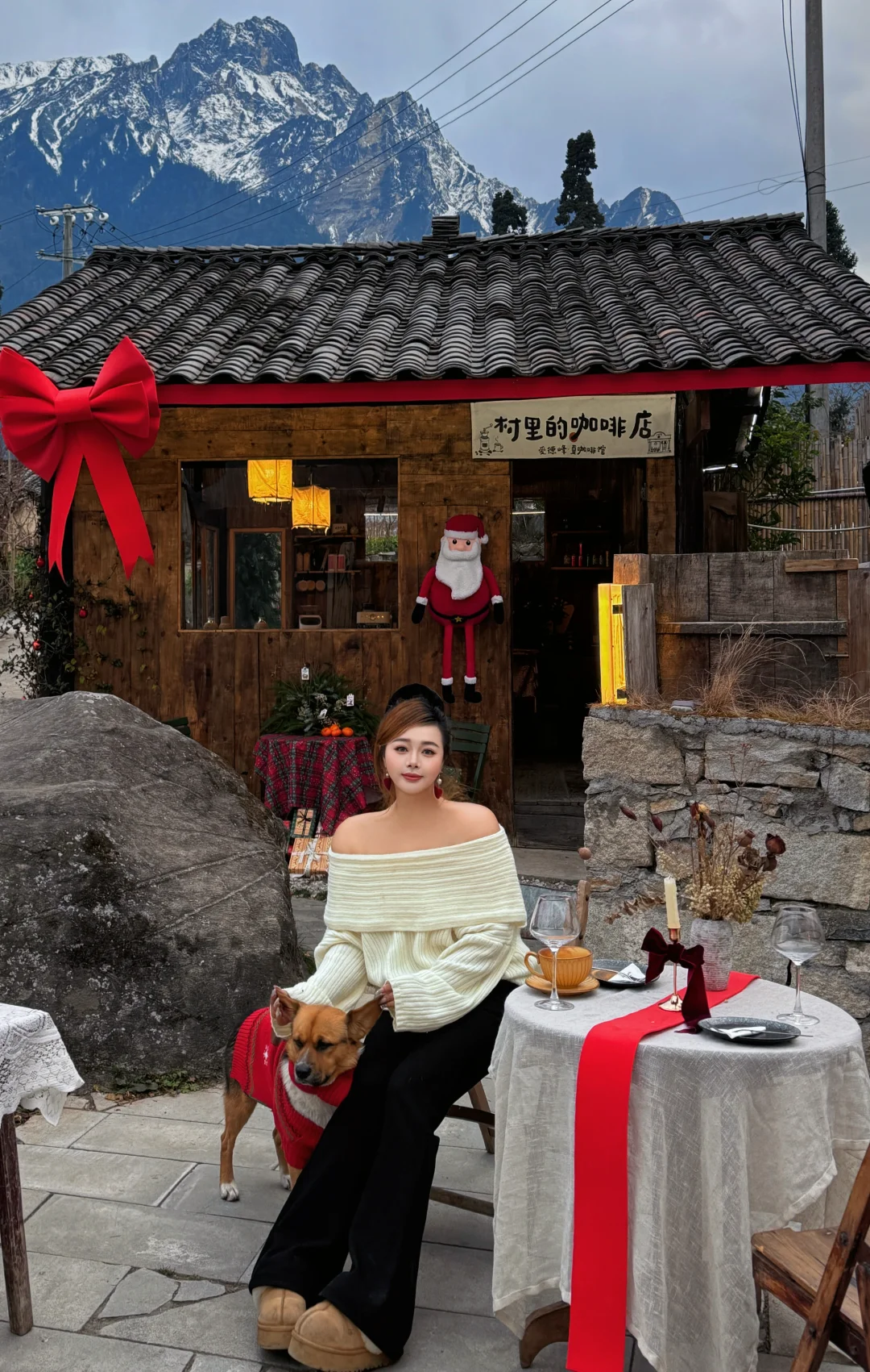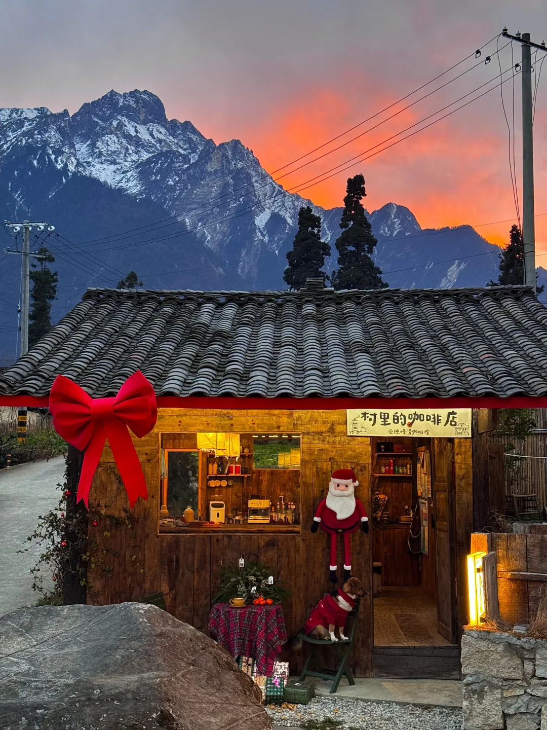 啊啊啊‼️雪山下木屋咖啡店真的好美 整个店都是浓烈的圣诞氛围 日落、晚霞、雪山、木屋、在灯光的氛围下真的是绝杀