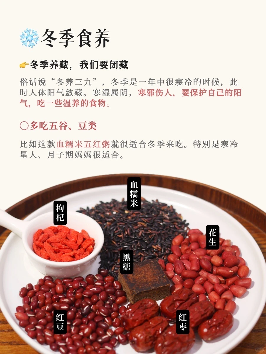 ❄️冬季是一年中寒冷的季节,这个时候我们的阳气在敛藏,寒邪伤人,一定要注意保暖御寒,多吃一些温养的食物。 ▪️血糯米五红粥就很适合秋冬来吃,这款五红粥是在五红汤的基础上增加的: 6种红色食材:红皮花生、红枸杞、红枣、红豆、血糯米、红糖。 五红汤温润口感好,冬季可以多吃几次。 红红润润,以红养红,在冬天寒冷的氛围里吃上一碗热乎乎的五红粥非常适合,软糯香甜。特别是月子妈妈、寒冷星人,老人孩子都可以一起吃哦~