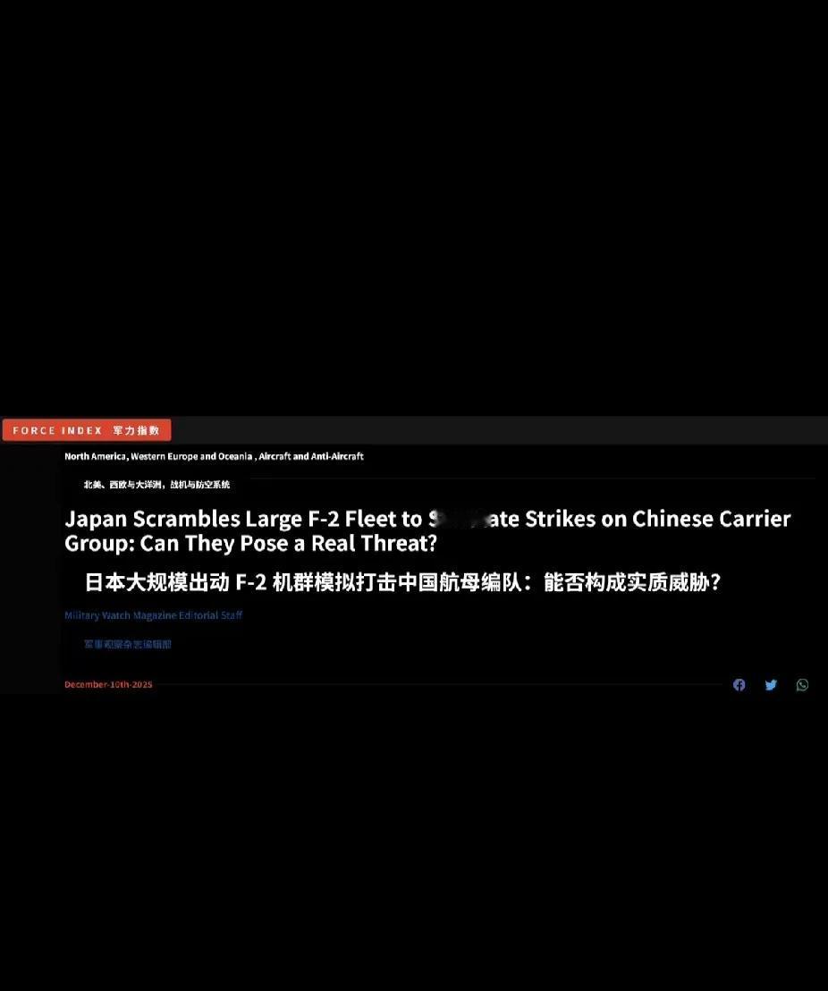 日本F-2机群模拟打辽宁舰,被美媒泼冷水脸丢大了! 日本这出闹剧真是笑掉大牙!12月10号中俄联合巡航、辽宁舰编队训练时,日本出动12架F-2挂满反舰导弹,高调模拟打击辽宁舰,结果被美国媒体狠狠打脸,直接反问“真有威胁吗”。 别看F-2挂了48枚导弹,可这战机是F-16的山寨版,老旧腿短,挂载的ASM-2反舰导弹还是亚音速,射程才170公里。反观辽宁舰编队,055、052D护航带着上百枚防空导弹,歼-15舰载机的空空导弹射程远超ASM-2,F-2还没靠近发射阵位就得被收割。更别提日本能拿得出手的也就这老掉牙的F-2,F-15J航电落后,F-35A连超视距导弹都射不了。 美媒直接戳破,这操作跟二战神风敢死队没差,纯属自不量力。等咱航母配齐预警机,日本连理论突防的可能都没有,省省吧!