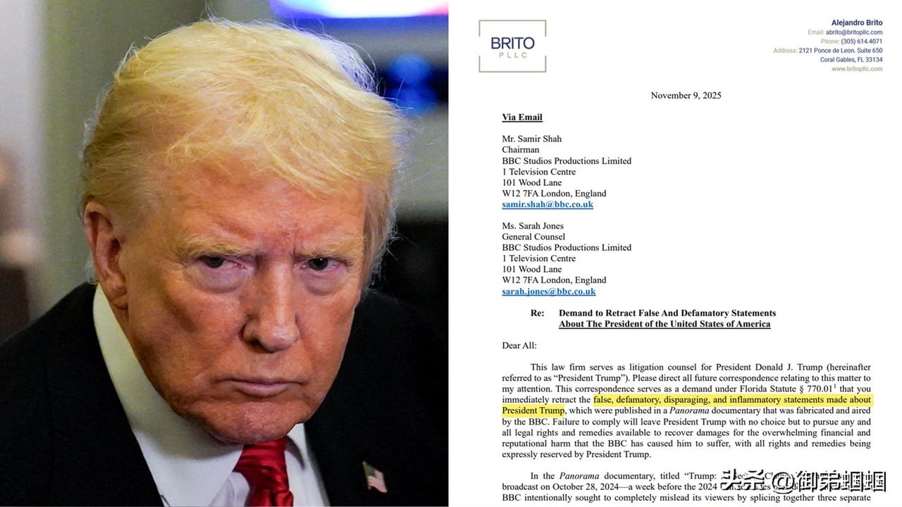 特朗普就纪录片起诉BBC索赔100亿美元 总统特朗普周一对BBC提起了100亿美元的诉讼,指控其诽谤和不公平贸易行为,理由是2024年的一部纪录片对他2021年1月6日的演讲进行了剪辑,他声称这造成了误导性的印象,暗示他煽动了国会大厦骚乱 。 BBC的”全景”(Panorama)纪录片,将特朗普演讲中相隔约50分钟的两个片段拼接在一起,BBC内部审查批评这种剪辑具有误导性,促使该网络的总裁蒂姆·戴维(Tim Davie)和新闻主管黛博拉·特内斯(Deborah Turness)辞职 。 该诉讼延续了特朗普对主要媒体机构的激进诉讼策略,此前,CBS/派拉蒙因”60分钟”采访剪辑支付了1600万美元和解金,ABC因主播乔治·斯特凡诺普洛斯(George Stephanopoulos)的播出言论支付了1500万美元加诉讼费 。 BBC尚未正式回应诉讼,但此前表示将“坚决抗争”。案件后续进展值得关注,此类跨国媒体诽谤案涉及管辖权、言论自由保护及“实际恶意”证明门槛,专家认为特朗普胜诉难度较大,但诉讼本身已造成影响。 特朗普怒斥美国