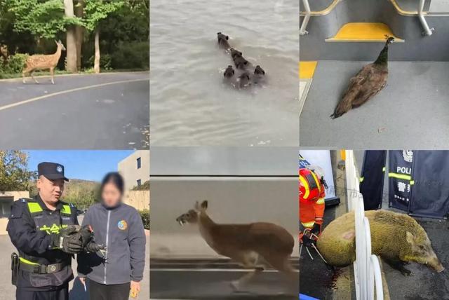 梅花鹿、獐子、野猪、孔雀、黑水鸡……今年的南京街头十分热闹。图源:南京消防、南京发布、南京交通广播