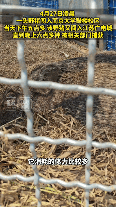 2025年4月,一头野猪先后闯入南京大学鼓楼校区和江苏电视台。被消防员和民警抓获后送往红山动物园。图源:江苏新闻