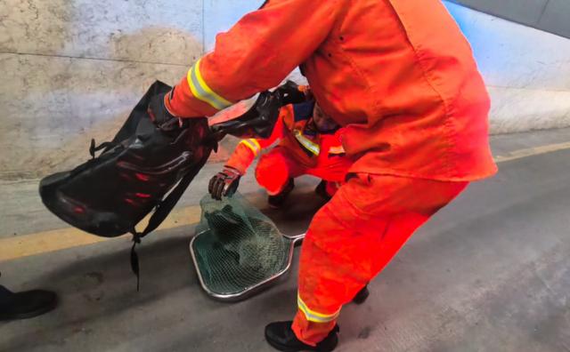 2025年12月8号,南京富贵山隧道内有果子狸出没,为防交通发生堵塞,消防员立即使用抄网和背包将其控制住,随后联系市内动物保护组织,确认其没有受伤后,将其带至紫金山放生。图源:南京消防