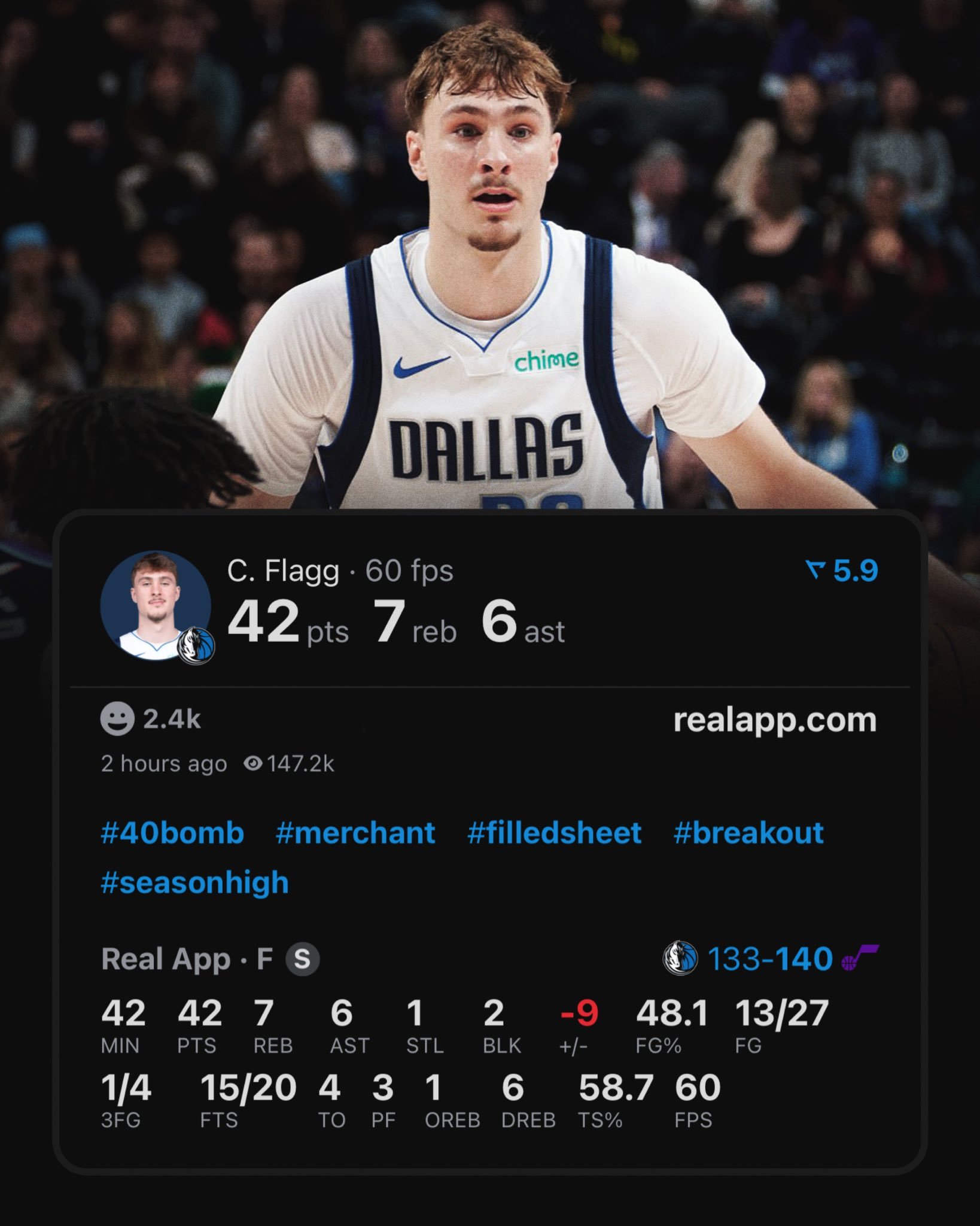 什么水平?!今天的弗拉格:——全场出战41分钟——投篮27中13,三分4中1,罚球20中15——拿下42分7篮板6助攻1抢断2盖帽——NBA历史首位在18岁单场砍下40+的球员——NBA历史最年轻40+先生——独行侠加时133-140不敌爵士越打越好,状元不愧是状元!爵士加时战胜独行侠弗拉格最年轻40分先生弗拉格超越詹姆斯