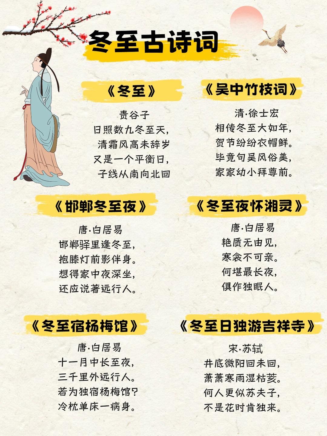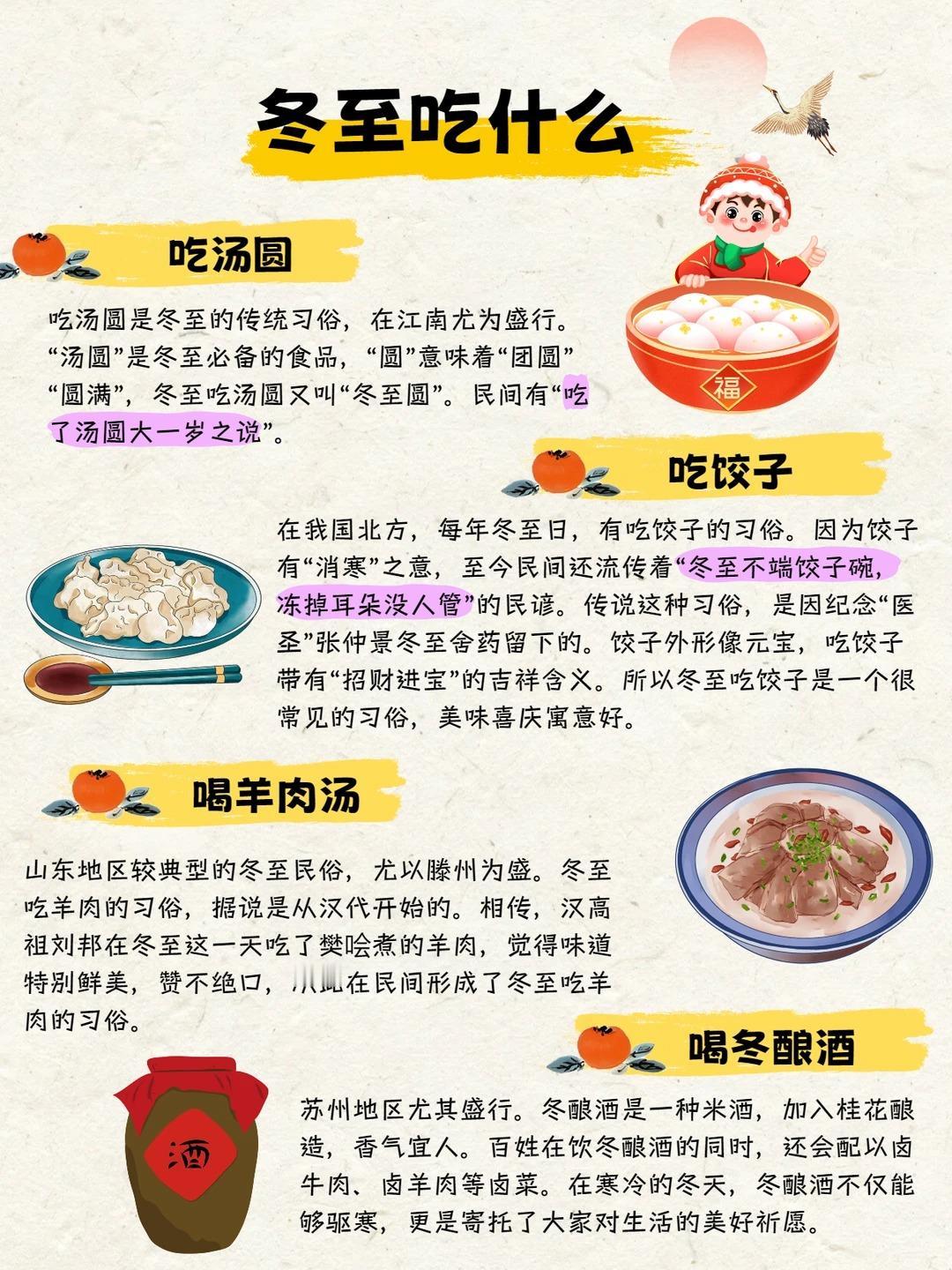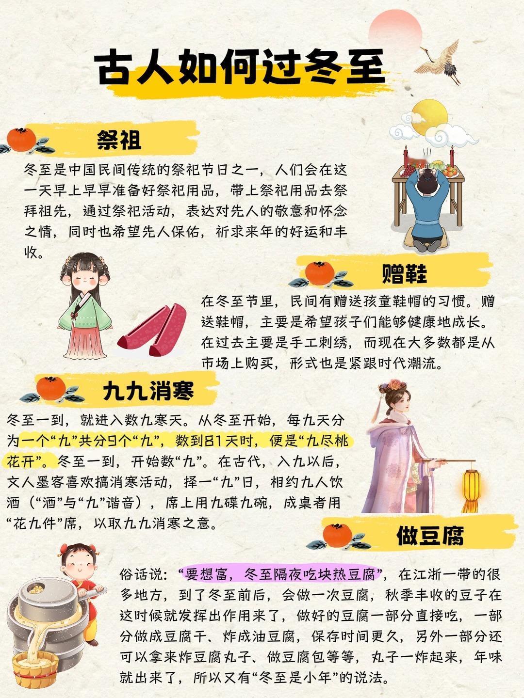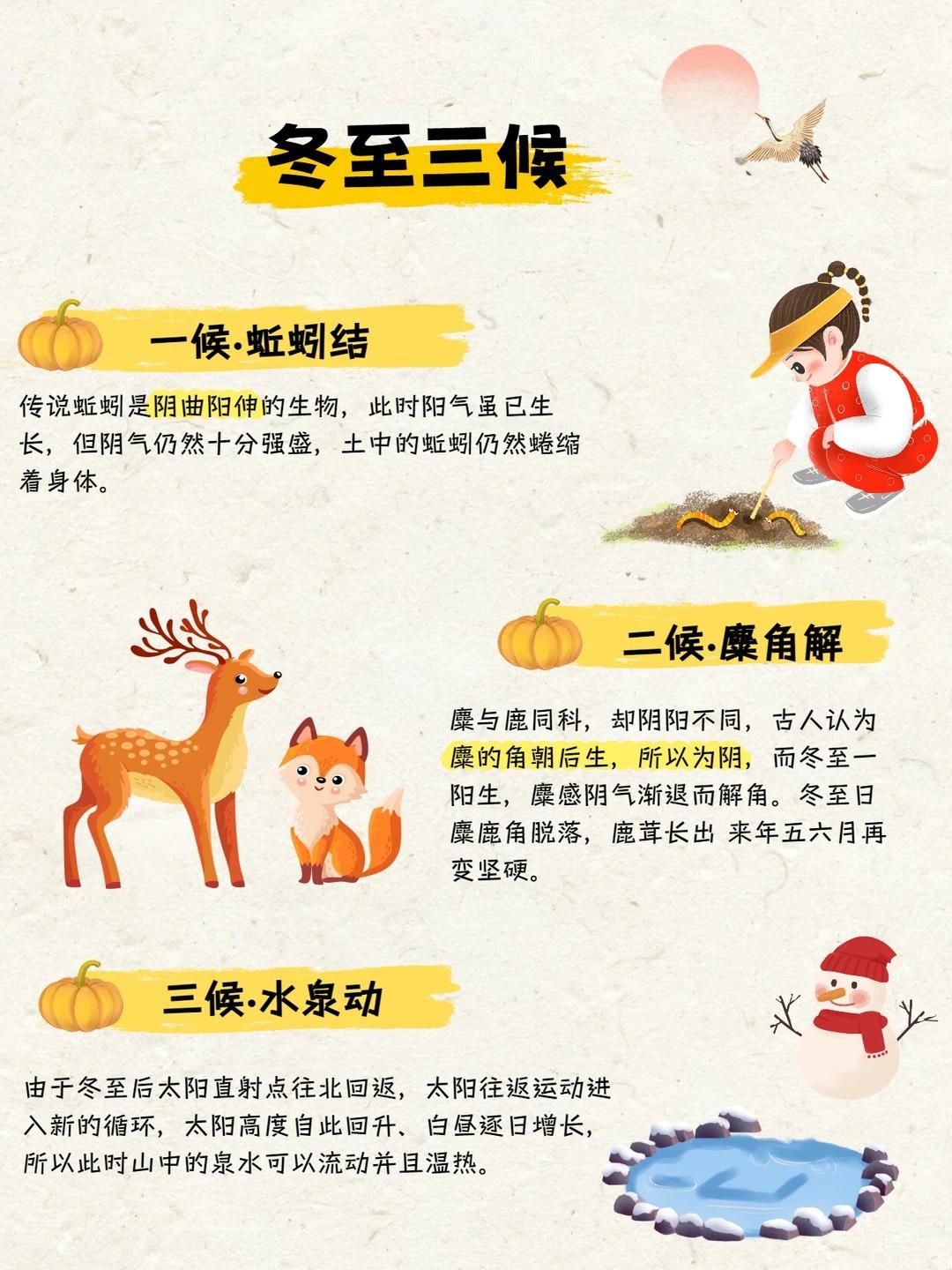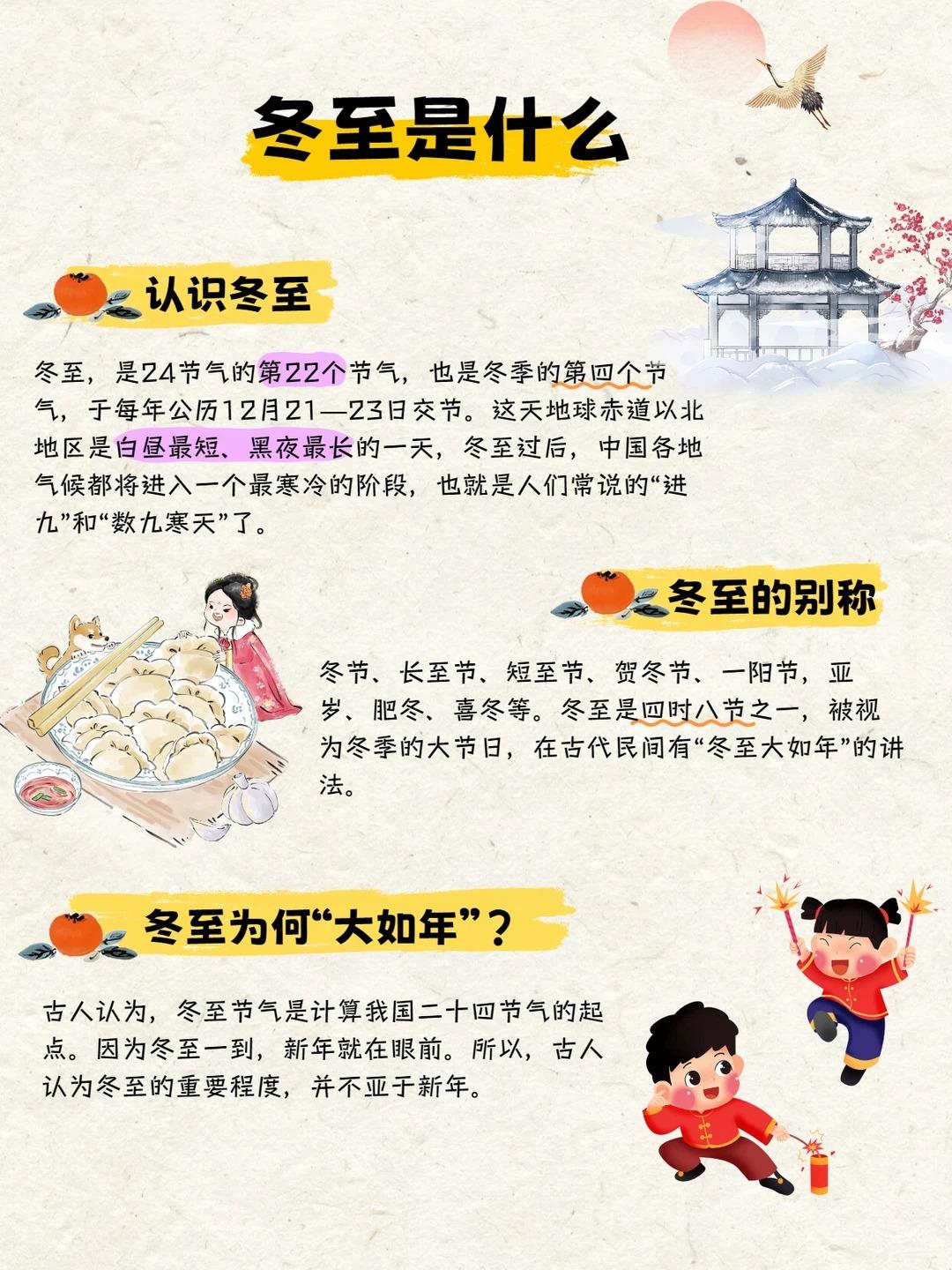 二十四节气知多少|冬至节气科普来喽❗️ ❄️认识冬至: 冬至,是24节气的第22个节气,也是冬季的第四个节气,于每年公历12月21—23日交节。这天地球赤道以北地区是白昼最短、黑夜最长的一天,冬至过后,中国各地气候都将进入一个最寒冷的阶段,也就是人们常说的“进九”和“数九寒天”了。 ❄️冬至别称: 冬节、长至节、短至节、贺冬节、一阳节,亚岁、肥冬、喜冬等。冬至是四时八节之一,被视为冬季的大节日,在古代民间有“冬至大如年”的讲法。 🌟传统习俗: 👉吃汤圆 吃汤圆是冬至的传统习俗,在江南尤为盛行。“汤圆”是冬至必备的食品,“圆”意味着“团圆”“圆满”,冬至吃汤圆又叫“冬至圆”。民间有“吃了汤圆大一岁之说”。 👉吃饺子 在我国北方,每年冬至日,有吃饺子的习俗。因为饺子有“消寒”之意,至今民间还流传着“冬至不端饺子碗,冻掉耳朵没人管”的民谚。传说这种习俗,是因纪念“医圣”张仲景冬至舍药留下的。饺子外形像元宝,吃饺子带有“招财进宝”的吉祥含义。所以冬至吃饺子是一个很常见的习俗,美味喜庆寓意好。 👉赠鞋 在冬至节里,民间有赠送孩童鞋帽的习惯。赠送鞋帽,主要是希望孩子们能够健康地成长。在过去主要是手工刺绣,而现在大多数都是从市场上购买,形式也是紧跟时代潮流。 👉喝羊肉汤 山东地区较典型的冬至民俗,尤以滕州为盛。冬至吃羊肉的习俗,据说是从汉代开始的。相传,汉高祖刘邦在冬至这一天吃了樊哙煮的羊肉,觉得味道特别鲜美,赞不绝口,从此在民间形成了冬至吃羊肉的习俗。 👉九九消寒 冬至一到,就进入数九寒天。从冬至开始,每九天分为一个“九”共分9个“九”,数到81天时,便是“九尽桃花开”。冬至一到,开始数“九”。在古代,入九以后,文人墨客喜欢搞消寒活动,择一“九”日,相约九人饮酒(“酒”与“九”谐音),席上用九碟九碗,成桌者用“花九件”席,以取九九消寒之意。 更多节气传统文化知识详见图片,让我们一起为中国传统文化打Call!