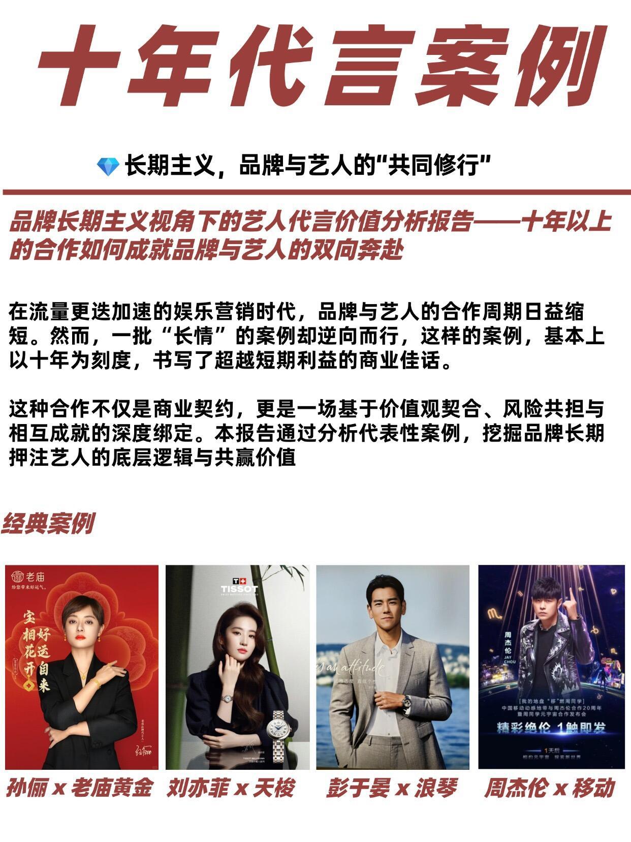 彭于晏 今天来看那些十年以上的商业代言十年以上的合作是品牌与艺人的共同成长共同成就摘录于网络分析:【在流量更迭加速的娱乐营销时代,品牌与艺人的合作周期日益缩短。然而,一批“长情”的案例却逆向而行,这样的案例,基本上以十年为刻度,书写了超越短期利益的商业佳话。这种合作不仅是商业契约,更是一场基于价值观契合、风险共担与相互成就的深度绑定。该报告通过分析代表性案例,挖掘品牌长期押注艺人的底层逻辑与共赢价值:💎长期主义,品牌与艺人的“共同修行”十年代言人里的特别款——孙俪-“爱家大使”的商业IP⭐周杰伦×动感地带(2003年至今):从“我的地盘”到元宇宙伙伴⭐刘亦菲× 天梭(2015年至今):国民度与全球化传播的双赢⭐谢霆锋×特步(2001年至今):低谷陪跑,成就国民品牌“合伙人”⭐舒淇×雅诗兰黛(2011年至今):国际影后与奢华护肤的“气质共生”⭐彭于晏与浪琴(2014年至今):精准人群击穿与口碑沉淀⭐周迅与香奈儿(2011年至今):高级感与品牌精神的共生……