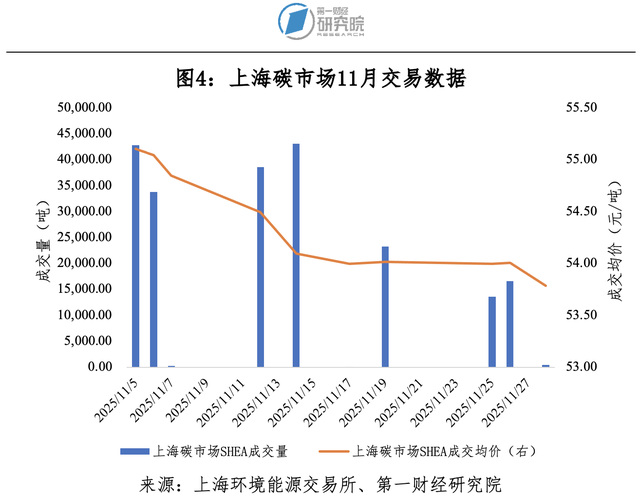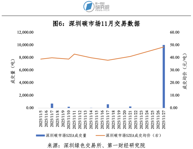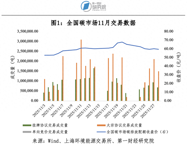 11月,全国碳市场碳排放配额(CEA)挂牌协议交易成交均价为59.27元/吨,环比上涨约30%。11月,钢铁、水泥、铝冶炼行业配额总量与分配方案出炉,叠加配额清缴截止时间临近,双重利好因素推动碳价回升。
