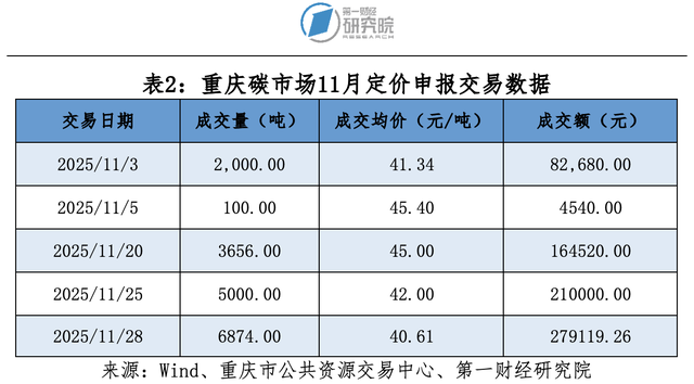 11月重庆碳市场碳排放配额(CQEA)定价申报交易成交量17630吨,成交额74.09万元,成交均价42.02元/吨。11月成交申报交易成交量12381吨,成交额53.24万元。