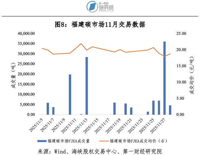 11月福建碳市场碳排放配额(FJEA)成交量13.04万吨,成交额249.60万元。11月最后一个交易日收盘价18.81元/吨,较10月最后一个交易日收盘价19.00元/吨下跌1.00%。
