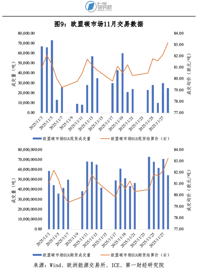 11月EUA现货成交量67.60万吨,结算价最低79.25欧元/吨,最高83.17欧元/吨;期货成交量10.90亿吨,结算价最低79.36欧元/吨,最高83.26欧元/吨。