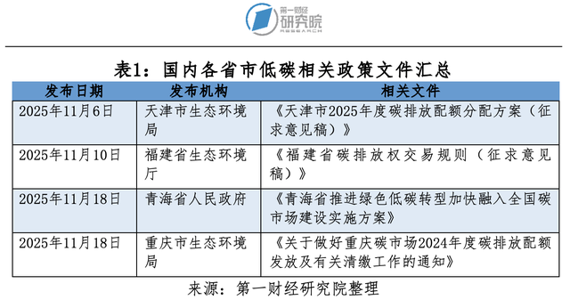 地方碳市场中,重庆2024年度碳排放配额发放及清缴工作应于2025年12月31日前完成。北京、天津、福建“十五五”规划提出强化碳市场建设等建议。