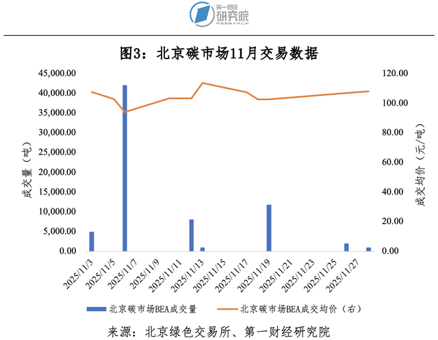 11月北京碳市场碳排放配额(BEA)成交量71596吨,成交额705.36万元,成交均价98.52元/吨。11月最后一个交易日成交均价108.27元/吨,较10月最后一个交易日成交均价105.24元/吨上涨2.88%。截至11月30日,自开市以来BEA累计成交量5923.54万吨(公开交易2160.98万吨,协议转让3750.56万吨,约定购回12万吨),累计成交额32.57亿元。