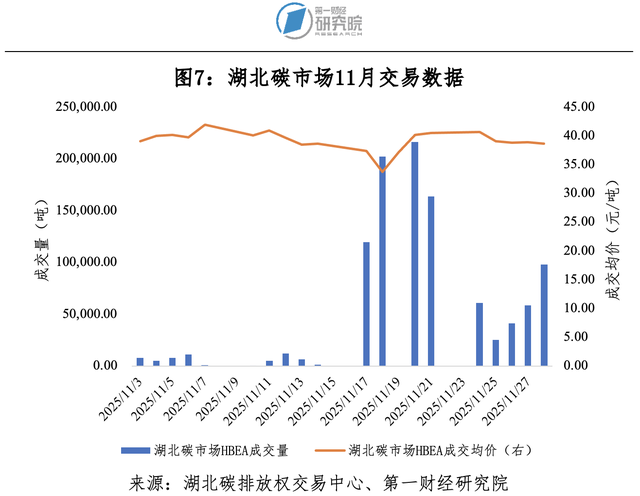 11月湖北碳市场碳排放配额(HBEA)交易成交量105.08万吨,成交额4038.64万元。期间,最高价42.48元/吨,最低价33.70元/吨,成交均价38.43元/吨。11月最后一个交易日收盘价38.72元/吨,较10月最后一个交易日收盘价39.54元/吨下跌2.07%。截至11月30日,自开市以来HBEA(不包括逆回购和还碳)累计成交量4.20亿吨,累计成交额104.08亿元。