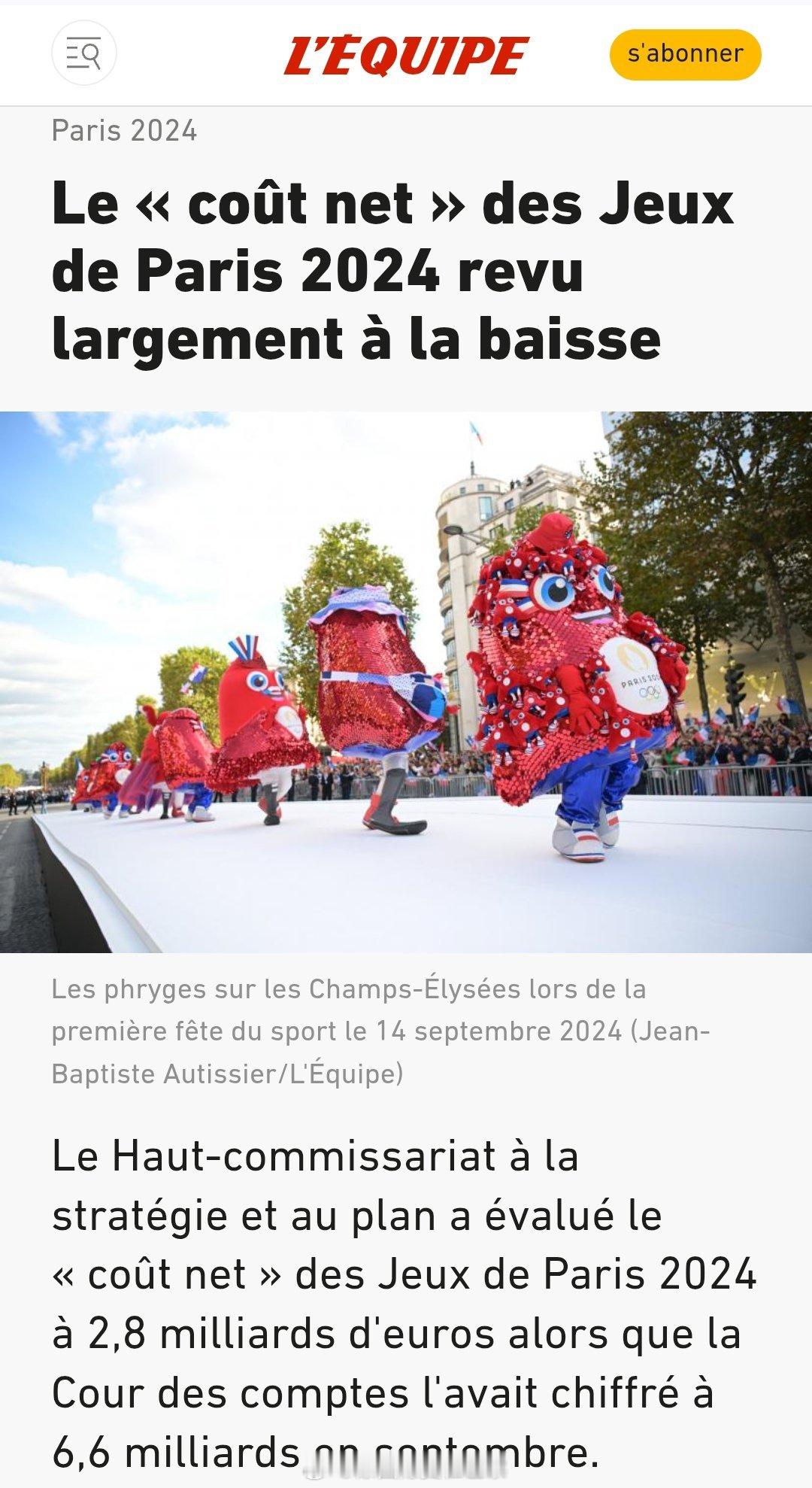 海外新鲜事 最终,巴黎奥运会的花费“只有”28亿欧元法国战略与规划高级专员办公室(Haut-commissariat à la stratégie et au plan)评估称2024年奥运会和残奥会的“实际成本”不足30亿欧元,仅为最初估算的一半。此前法国审计院曾估计公共支出总额为66亿欧元。6个月之后,这个官方智库公布的新数字降至28亿欧元。这个“实际成本(net cost)”在计算中考虑了经济、社会和环境等隐形收益,对比了审计院之前的总成本数。 法兰西的故事巴黎奥运会