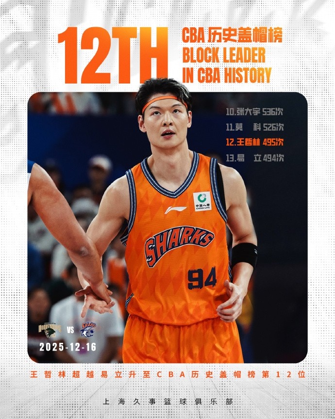 比赛进行到第二节,王哲林送出个人本场第2次盖帽。至此,王哲林CBA生涯盖帽总数上升至495次,超越易立的494次,升至CBA历史盖帽榜第12位!