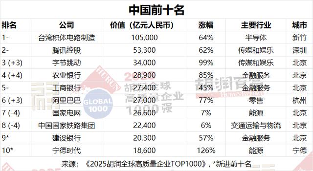 据悉,中国上榜企业中,表现最好的是台积电,价值增长了64%至10.5万亿元人民币,位列中国企业榜单第一名。腾讯控股价值增长了62%至5.33万亿元人民币,位列中国企业榜单第二名。其他表现突出的企业还包括字节跳动价值增长了99%,至3.4万亿元人民币;农业银行价值增长了85%,至2.89万亿元人民币;阿里巴巴价值增长了77%,至2.7万亿元人民币。