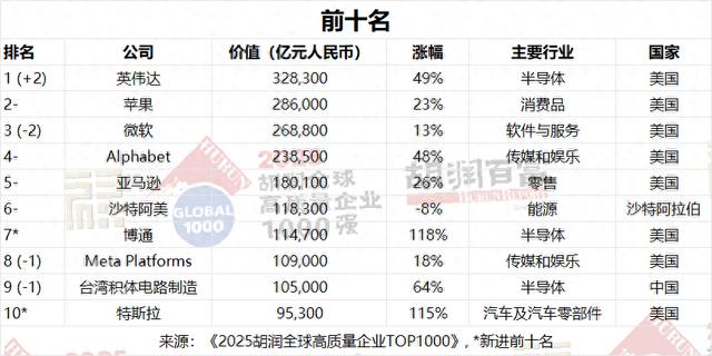 2025年胡润全球高质量企业前十名由美国科技巨头主导,其中英伟达、苹果、微软、Alphabet、亚马逊、博通、MetaPlatforms、特斯拉来自美国,沙特阿拉伯上榜的企业有沙特阿美,中国上榜的企业有台积电。