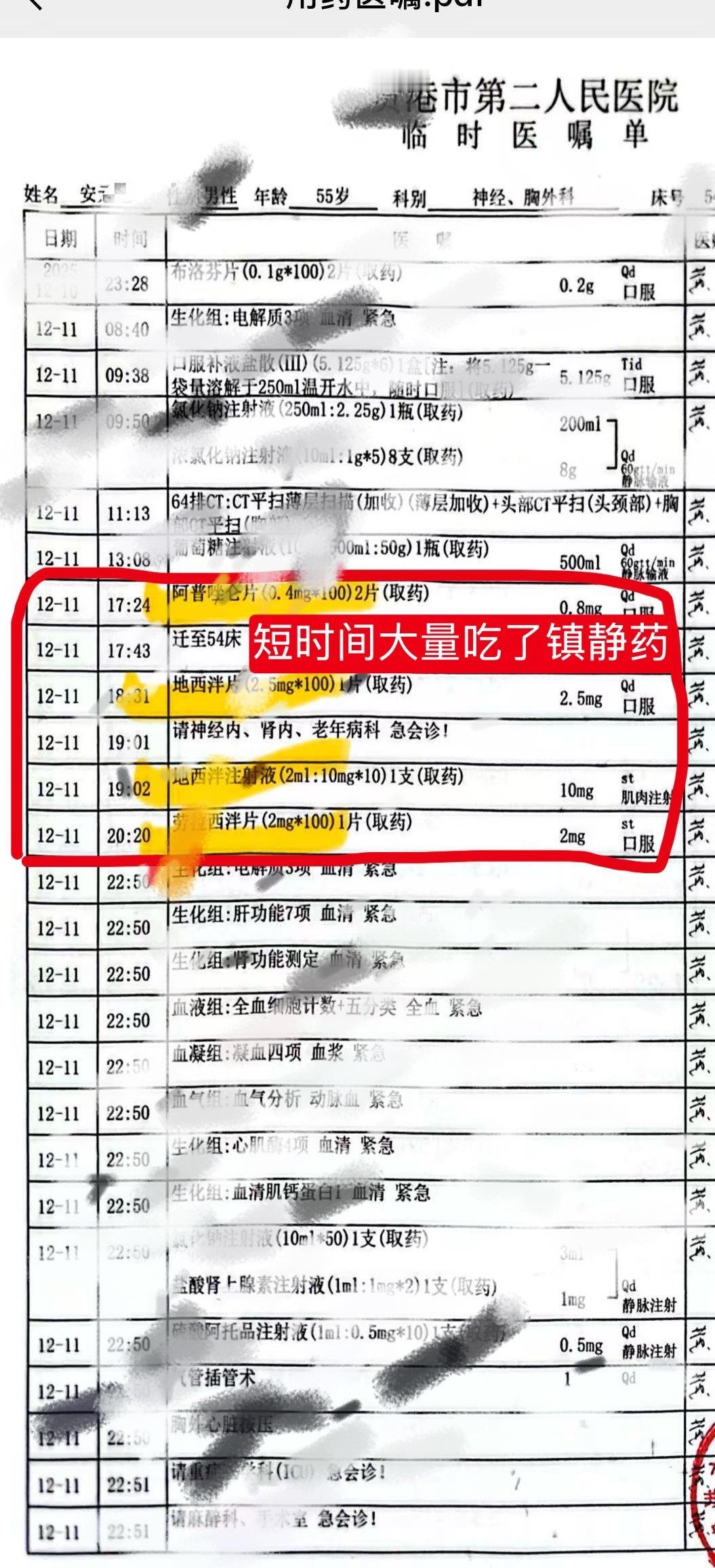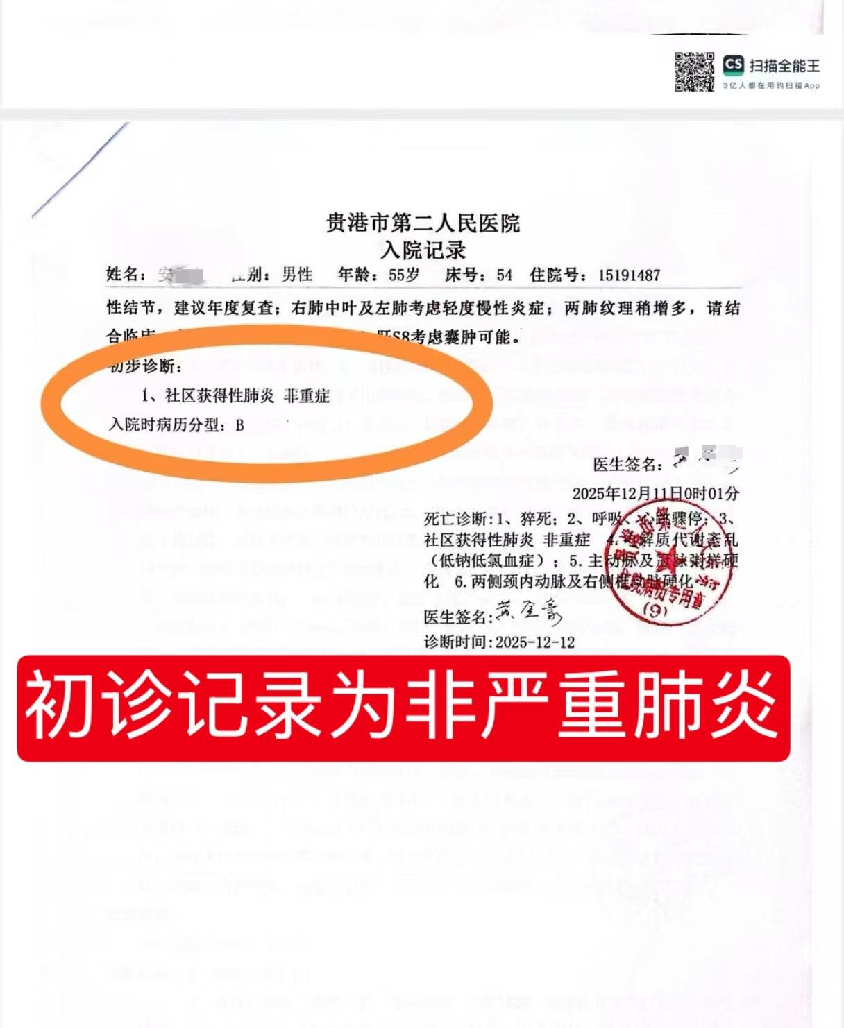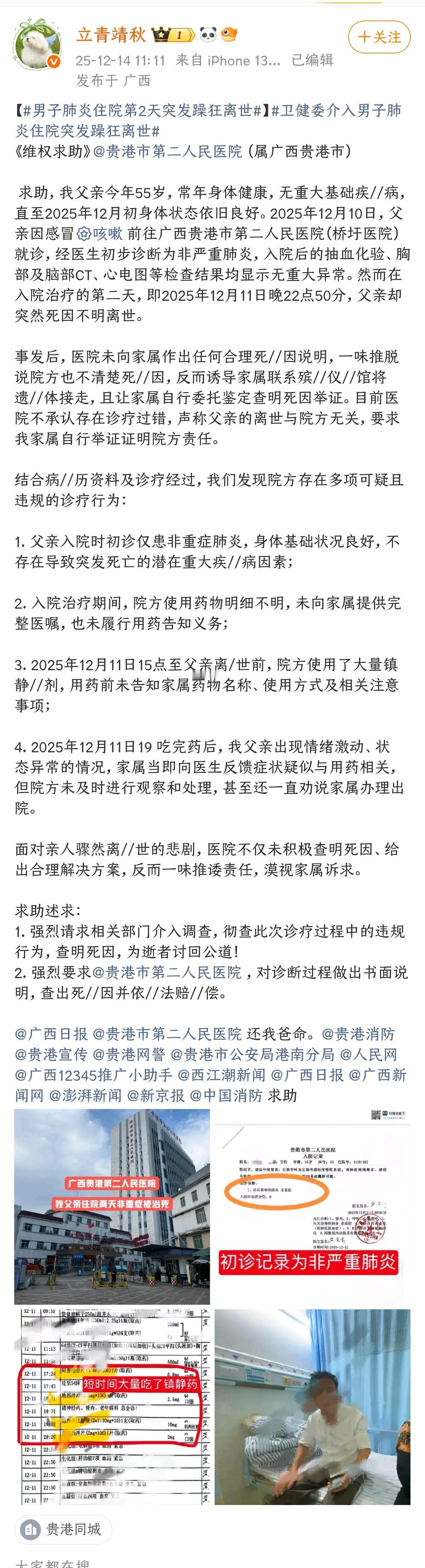 男子因咳嗽入院治疗仅2天,突发狂躁生前大喊“药有毒”“别给我吃”,抢救无效离世! 广西贵港一名55岁患者安富生10日因持续咳嗽就诊于贵港市第二人民医院,被诊断为“社区获得性肺炎”,入院接受常规治疗。 11日服用药物后情绪失控,出现躁狂症状,高喊“药有毒”“不要吃安眠药”,并自行拔除留置针。 当晚22:50病情急剧恶化,呼吸心跳骤停,抢救1小时后无效死亡。病程记录显示,从突发躁狂到死亡仅6小时。 家属表示,事发后医院未作出合理死因说明,反而诱导家属接走遗体,要求家属自行委托鉴定举证,且不承认诊疗过错。结合病历及诊疗经过。 家属指出院方多项可疑违规行为:一是患者无突发死亡的潜在重大疾病因素;二是未提供完整医嘱,未履行用药告知义务;三是12月11日15点后使用大量镇静剂,用药前未告知相关信息;四是患者19点服药后出现情绪激动等异常,家属反馈后院方未及时处理,还劝说办理出院。 家属诉求相关部门介入调查,彻查违规行为、查明死因,要求医院作出书面说明并依法赔偿。目前,卫健委已介入该事件。