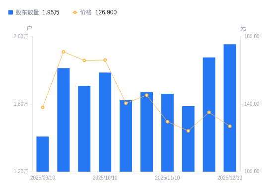 日期A股户数(户)流通A股户均持股数(股)户均持股市值(万元)2025-12-10195482942.4937.342025-11-28187713064.2941.432025-11-20158823621.7044.972025-11-10166163461.7244.862025-10-31167243439.3649.992025-10-20162373542.5249.792025-10-10178783217.3553.462025-09-30170913365.5155.862025-09-19181423170.5454.222025-09-10140804085.2256.42