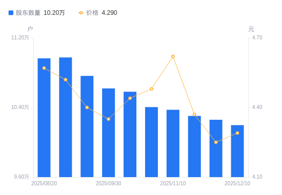近一年(2024年12月10日至2025年12月10日),长源电力A股股东户数从9.47万户,增加至10.2万户,增幅7.72%,区间股价下跌12.77%。