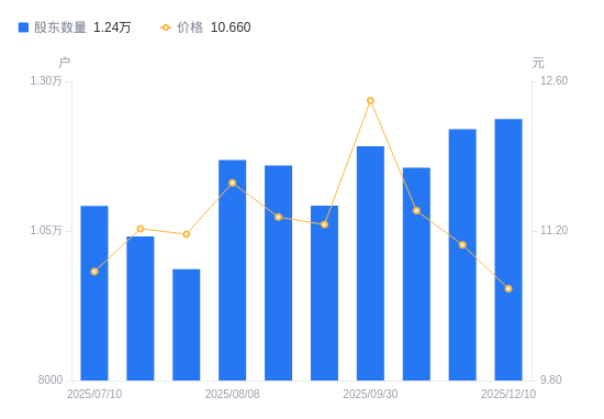 日期A股户数(户)流通A股户均持股数(股)户均持股市值(万元)2025-12-101237019295.5420.572025-11-101219919566.0221.662025-10-201155820651.1423.522025-09-301191520032.3924.882025-09-101092121855.6824.612025-08-201159420587.0223.332025-08-081168520426.6923.802025-07-31986224202.5827.032025-07-181041022928.5225.732025-07-101091821861.6923.65