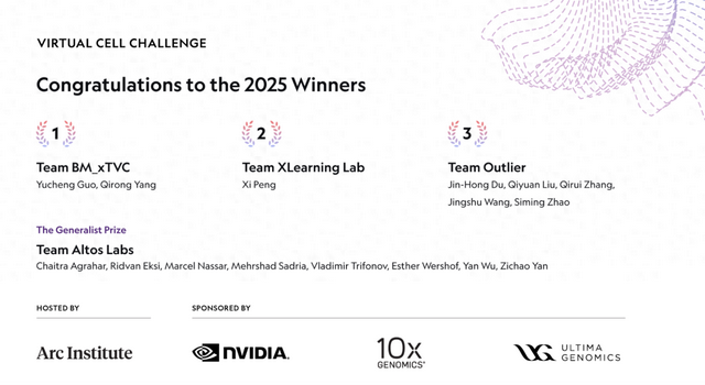 今年6月,《Cell》发表纲领性论文《TowardaTuringTestfortheVirtualCell》(迈向虚拟细胞的图灵测试),随后由ArcInstitute联合斯坦福大学、加州大学等顶尖机构共同发起了首届虚拟细胞挑战赛,并获得NVIDIA、10xGenomics等产业领军企业的赞助,吸引了全球包括斯坦福大学、耶鲁大学、谷歌、百度、Genentech等数千支顶尖团队参与。