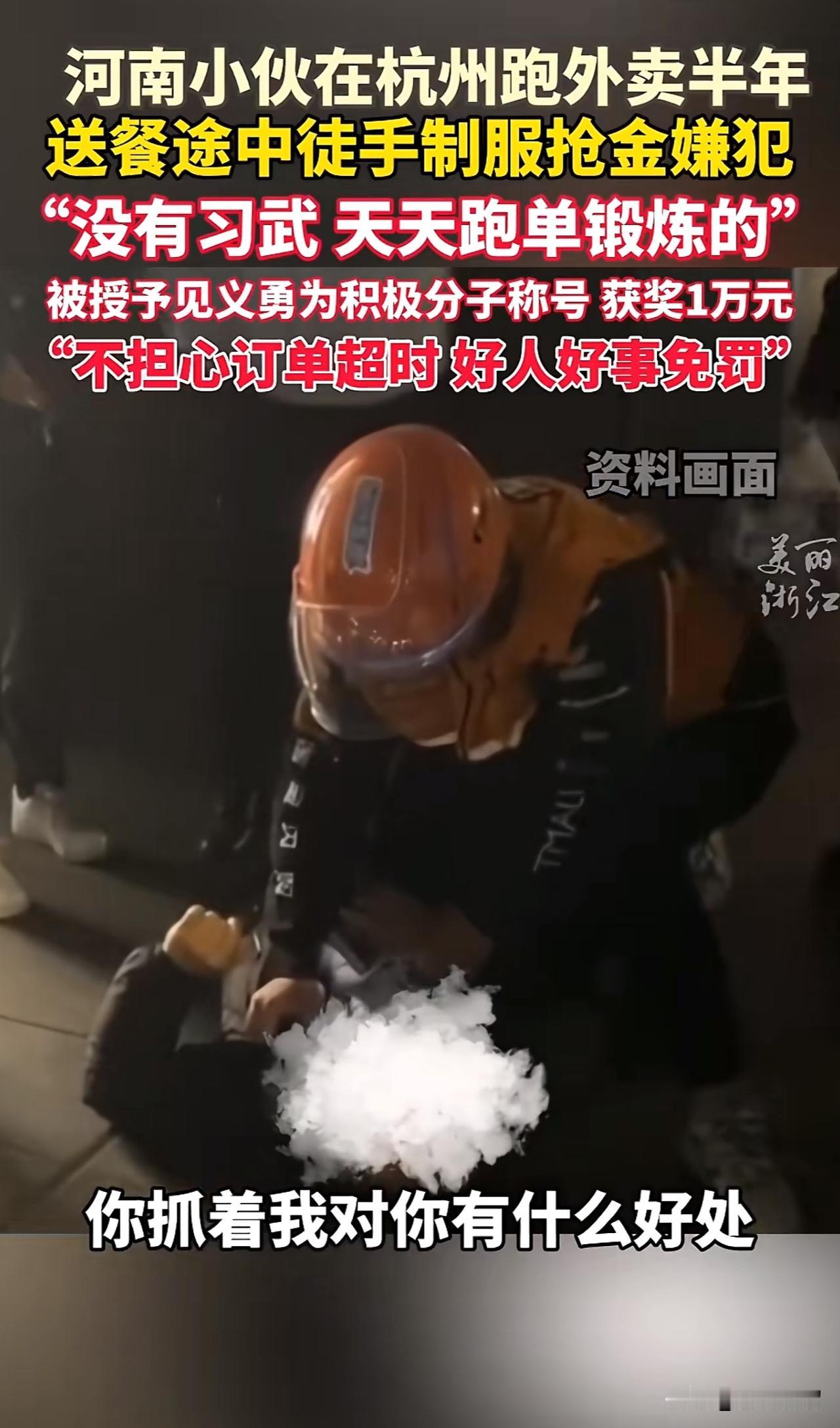 这名外卖小哥火了。 这名小伙名叫柴振鹏,是一名外卖配送员。12月15日晚7点多,一名男子在杭州外象汇商场负一楼的一家珠宝店抢夺金镯子后,迅速逃离现场。彼时,柴振鹏恰好到该商场送外卖。说时迟那时快,正往下走的他逆行冲上扶梯,一个箭步就将躲在一楼角落的男子制服,那速度,快准狠! 关键是,他在抓住歹徒的同时,也没耽误送外卖,这速度着实惊人! 事后,记者采访他时,这位小伙子腼腆地表示:“当时没多想,就觉得这是自己该做的事。” 鉴于柴振鹏的英勇事迹,外卖平台奖励他一万元现金,这也是对小伙子见义勇为行为的认可! 为这位00后外卖小哥点赞! (图片来源网络)