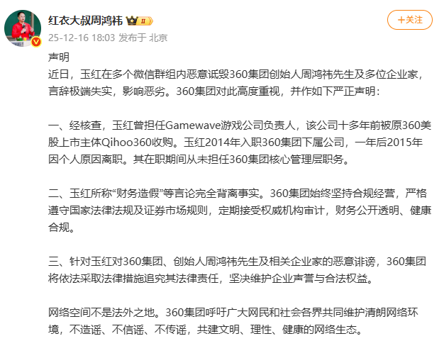 360集团表示,网络空间不是法外之地。360集团呼吁广大网民和社会各界共同维护清朗网络环境,不造谣、不信谣、不传谣,共建文明、理性、健康的网络生态。