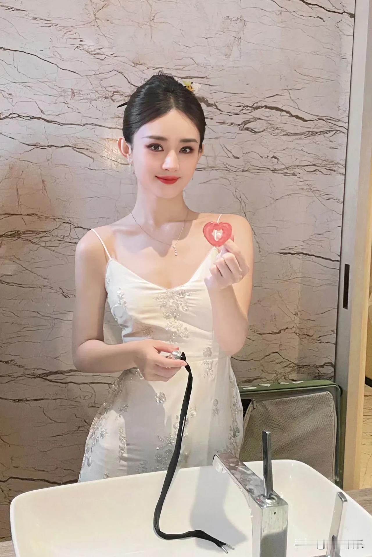 赵丽颖身穿白色吊带,清新脱俗,甜美笑容温暖人心。她轻轻比心,传递爱与正能量,让人