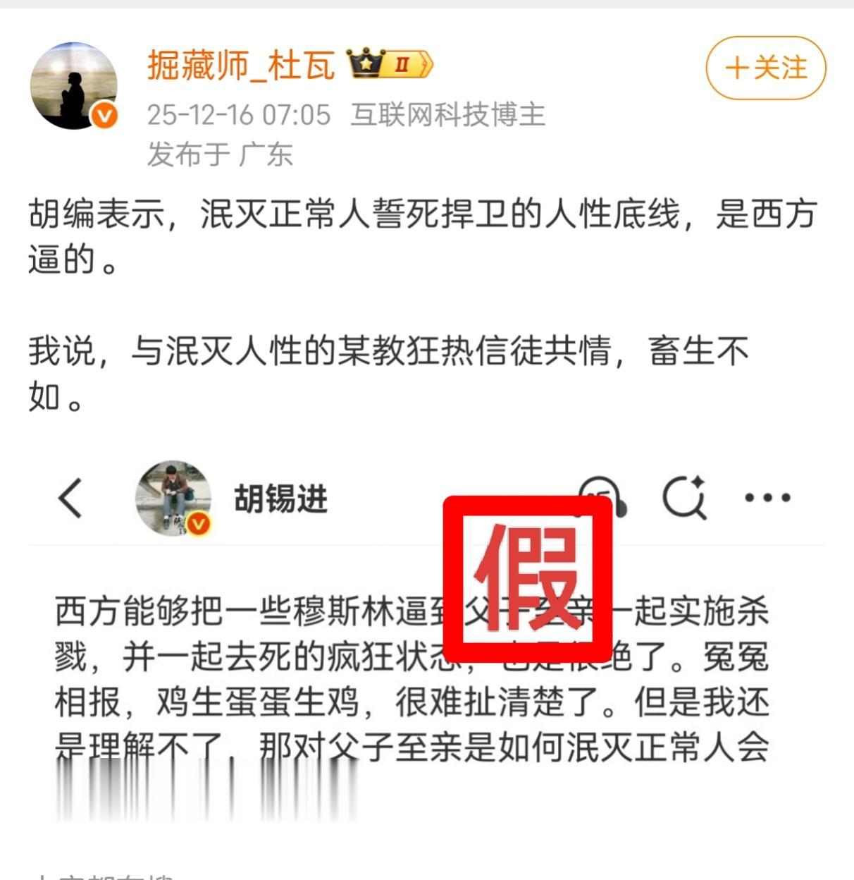 断章取义带节奏,给人上纲上线扣帽子,这是互联网最恶劣的乱象之一。 老胡周一夜里发了个帖子,痛斥澳大利亚邦迪海滩那对父子枪手大肆杀戮的行径泯灭人性。我的其中某句话如果有人认为说得不对,可以批评,但全文的态度很清楚,小学学过作文的人都能读懂。 但是这位博主居然指控老胡与恐袭发动者“共情”,因此“畜生不如”。大家可以看一看老胡的原帖,我是在与“某教狂热信徒”共情吗? 尤其不厚道的是,这位博主把老胡的帖子掐头去尾,截了一小段,伪装成我的原帖,贴到了他的发言之下。这是不是比指控我与恐怖分子“共情”,骂我“畜生不如”更加恶劣?准确说,这不光是断章取义了,而且涉嫌造假。 大家知道,他做的那个假图一次截不出来,需要拼接,挺费事。这家伙为了害人,蛮下力的。 老胡上社交媒体十几年,一次都没有举报过骂我的人。今天我也不打算按照社交平台的程序举报此博主。但我在这里把他挂出来,让大家认识一下这个有些偏执而且攻击他人不择手段的家伙。 批评老胡完全没问题,骂得重一些也没关系,但请不要伪造我的帖子。可以把我的帖子整个挂出来,把认为我最恶劣的话给圈红,但掐头去尾做剪裁,搞出一个所谓的老胡帖子来,这样的造假我认为就很缺德了。 我们可以争论,互怼,但是应当保持最基本的实事求是,不能把价值判断任意凌驾于事实判断之上。