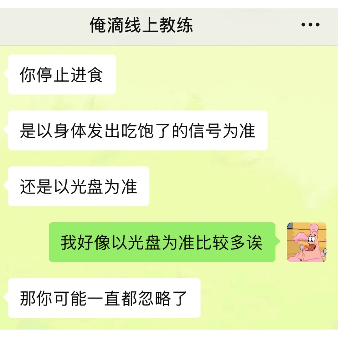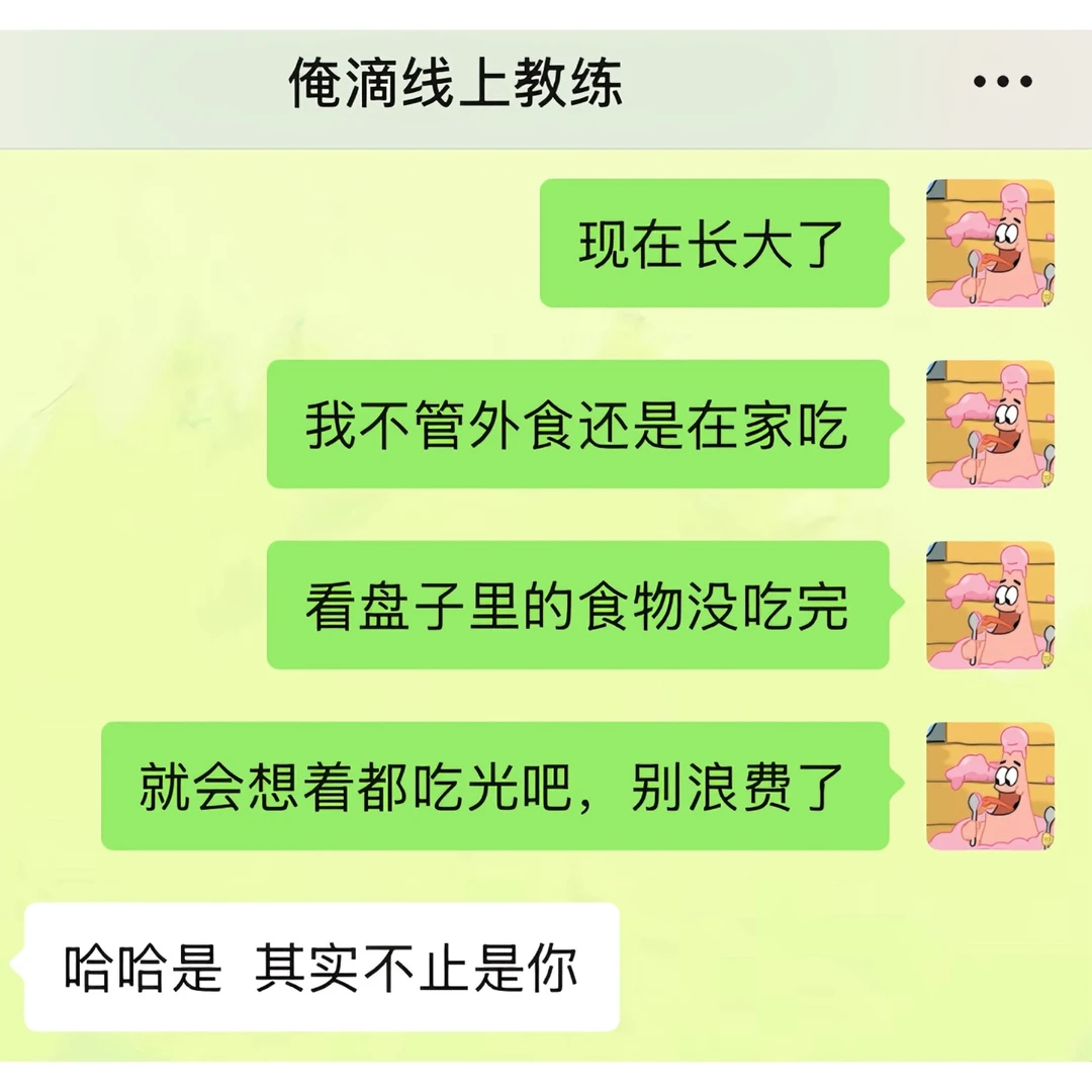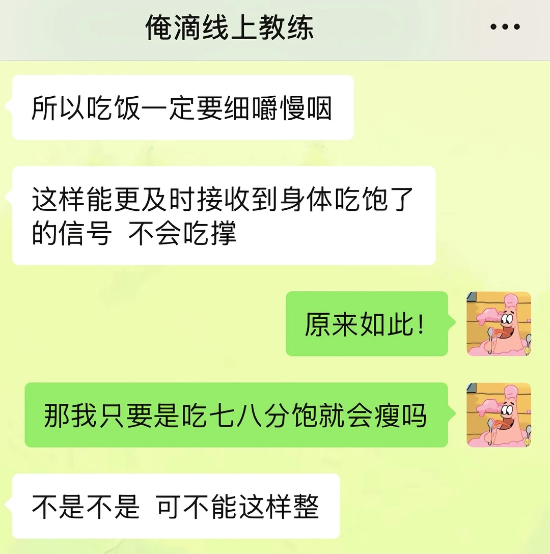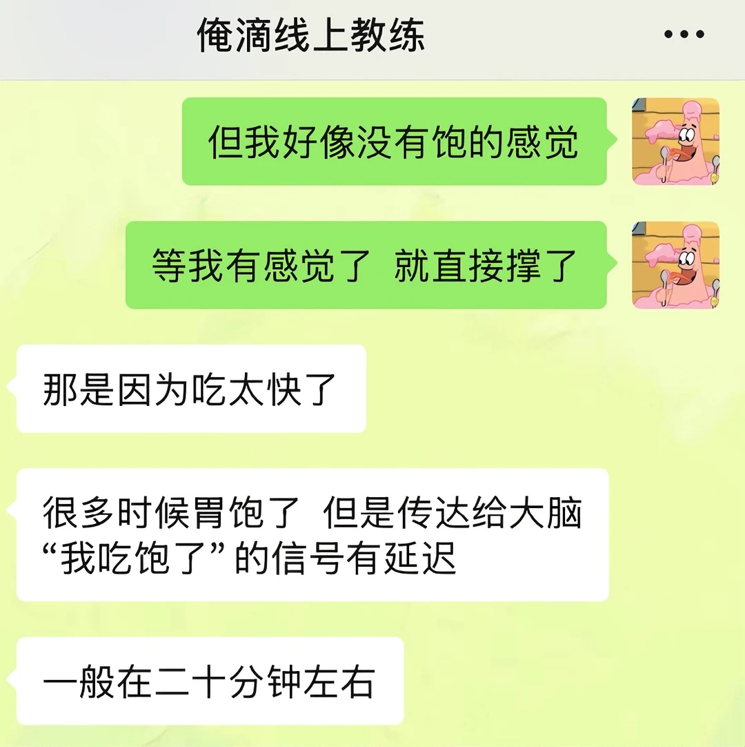 我之前吃饭一直都是狼吞虎咽型的,感觉大口吃饭很爽,经常这口没咽下去,下一口又续上了 直到线上教练姐给我科普了“有意识地吃东西”这个概念 今天午餐的时候我试了下:两个菜一碗米饭,吃了20分钟,最后没吃完就感觉到饱了 回想起我之前进食状态,每次都狼吞虎咽的吃,甚至不到十分钟都能吃完一顿饭,吃完之后还能再吃点零食溜溜缝,然后就感觉到好撑,肚子好胀 现在我算是明白了,之前每一餐,因为吃太快,额外摄入太多多余的食物了 以后是得学着细嚼慢咽了!