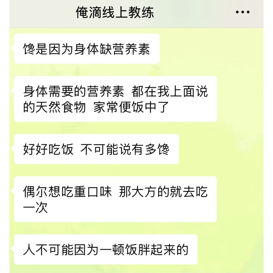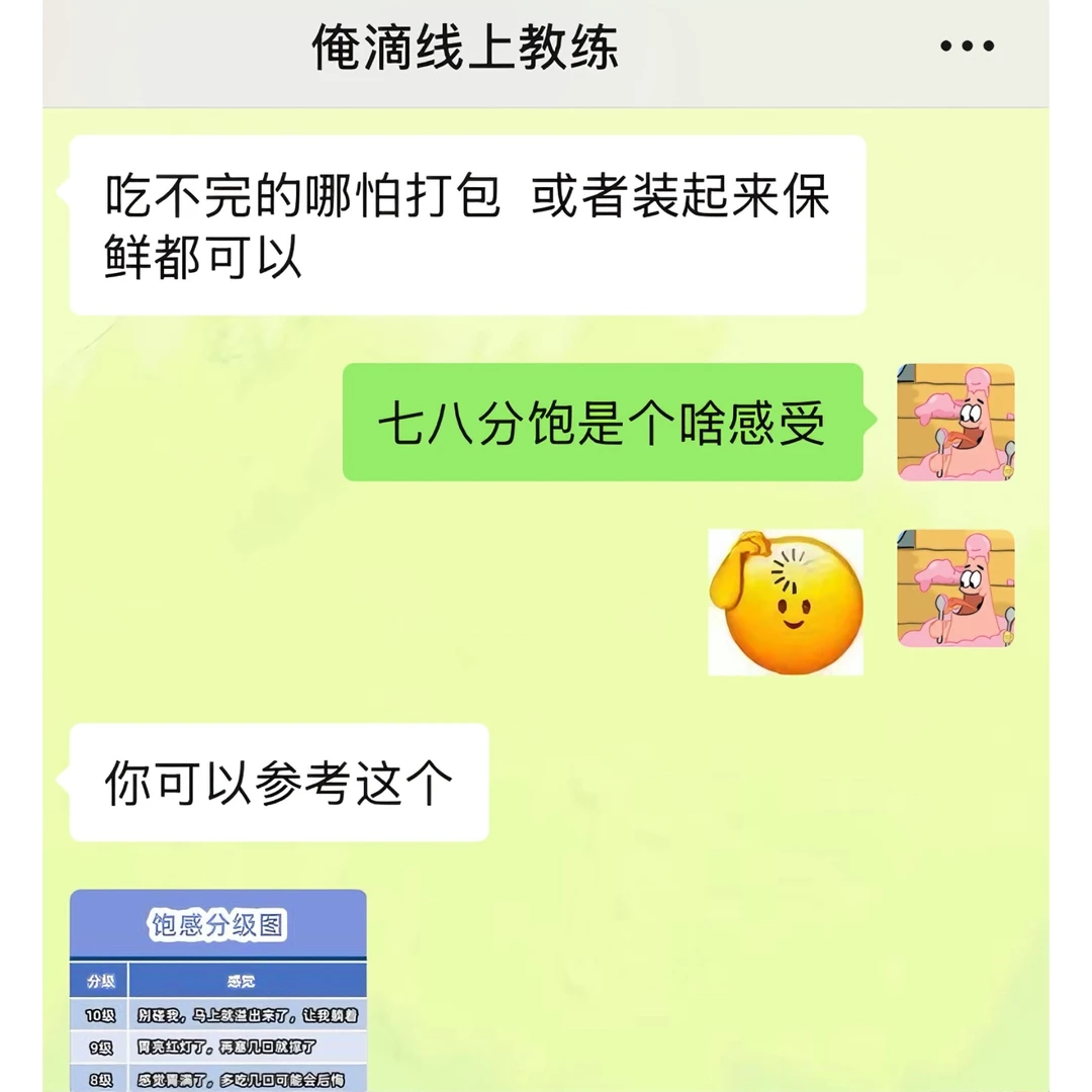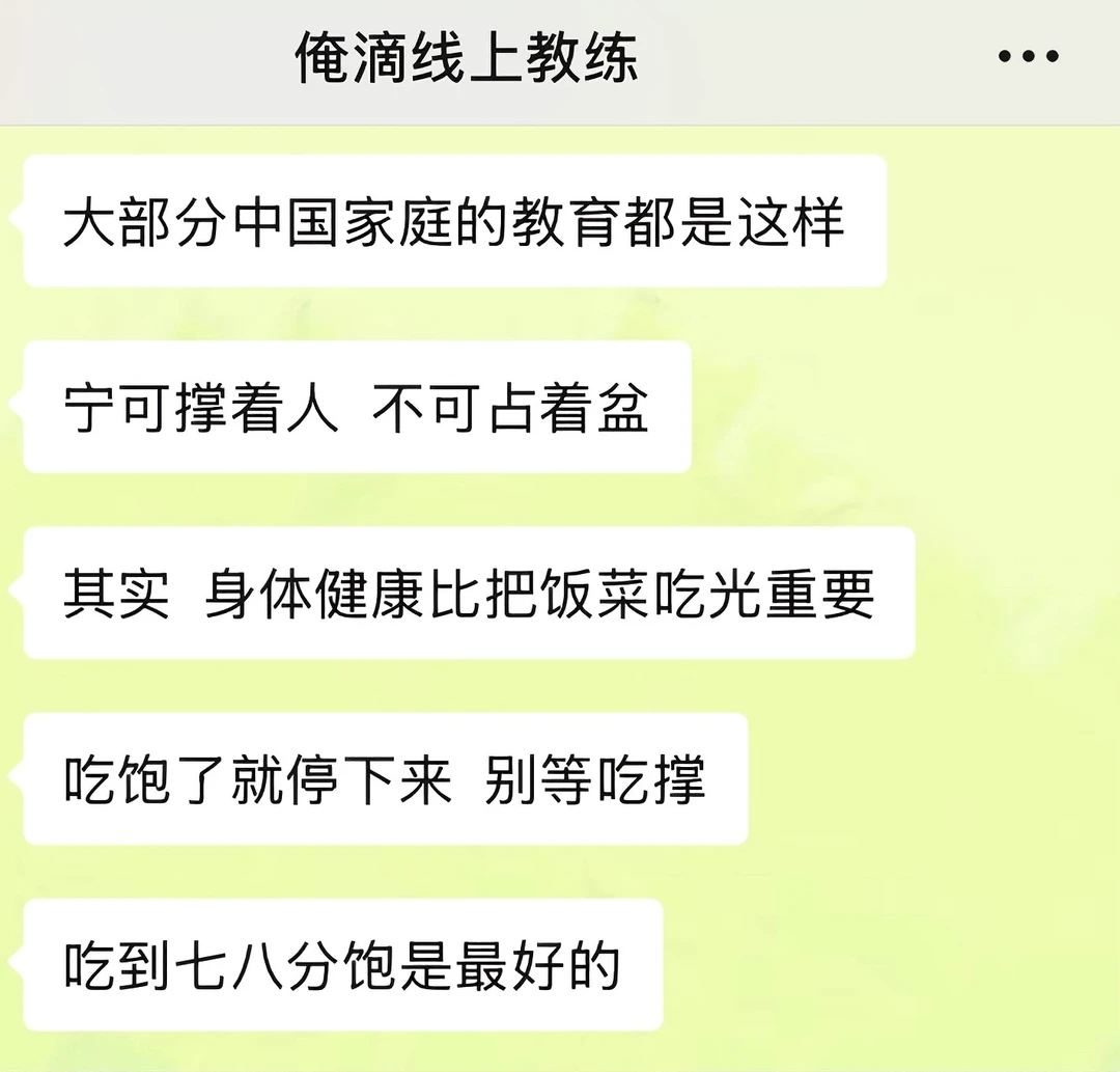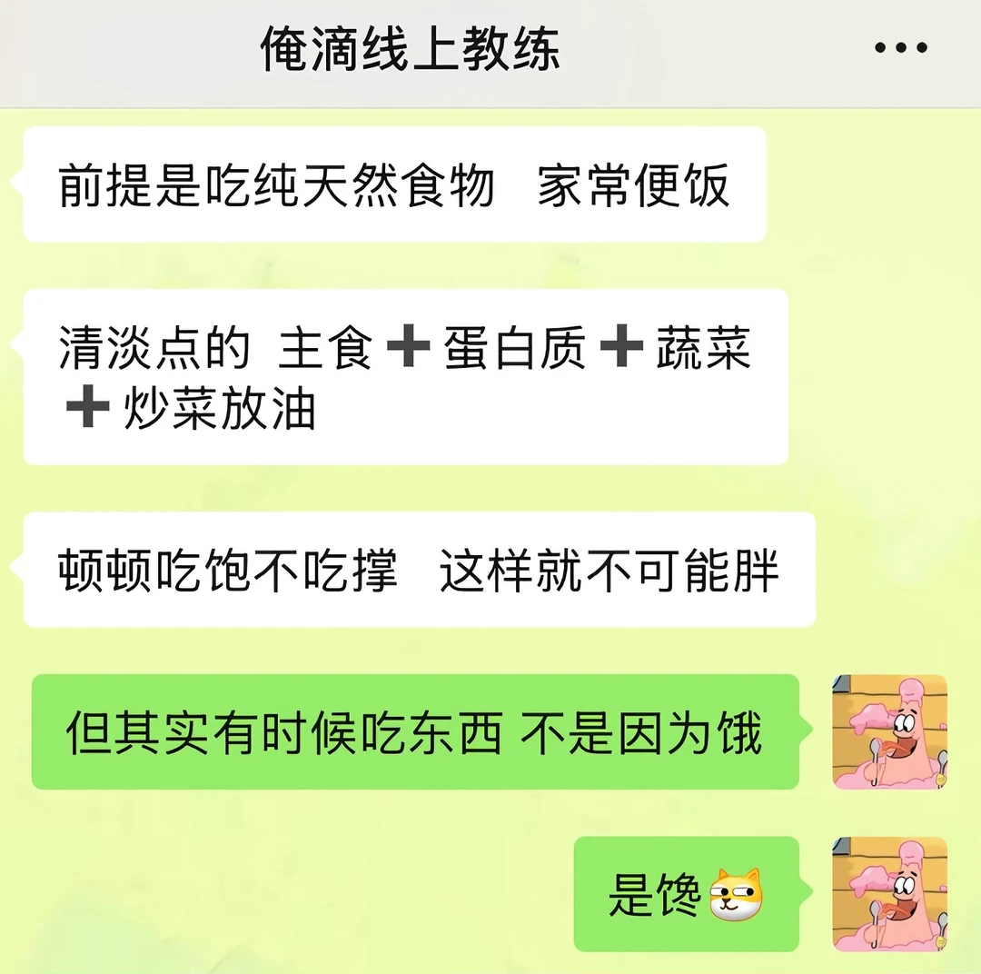 我之前吃饭一直都是狼吞虎咽型的,感觉大口吃饭很爽,经常这口没咽下去,下一口又续上了 直到线上教练姐给我科普了“有意识地吃东西”这个概念 今天午餐的时候我试了下:两个菜一碗米饭,吃了20分钟,最后没吃完就感觉到饱了 回想起我之前进食状态,每次都狼吞虎咽的吃,甚至不到十分钟都能吃完一顿饭,吃完之后还能再吃点零食溜溜缝,然后就感觉到好撑,肚子好胀 现在我算是明白了,之前每一餐,因为吃太快,额外摄入太多多余的食物了 以后是得学着细嚼慢咽了!