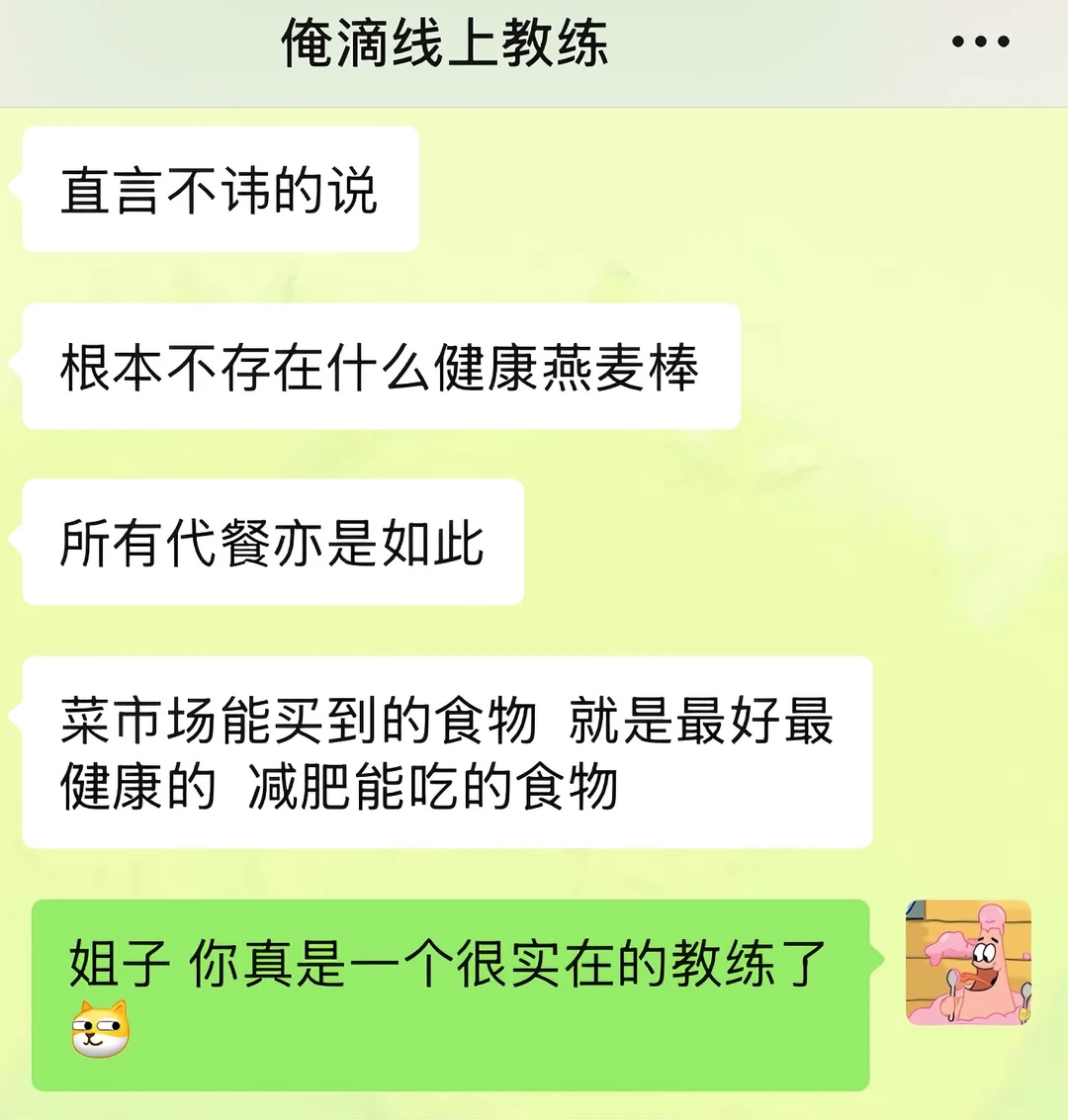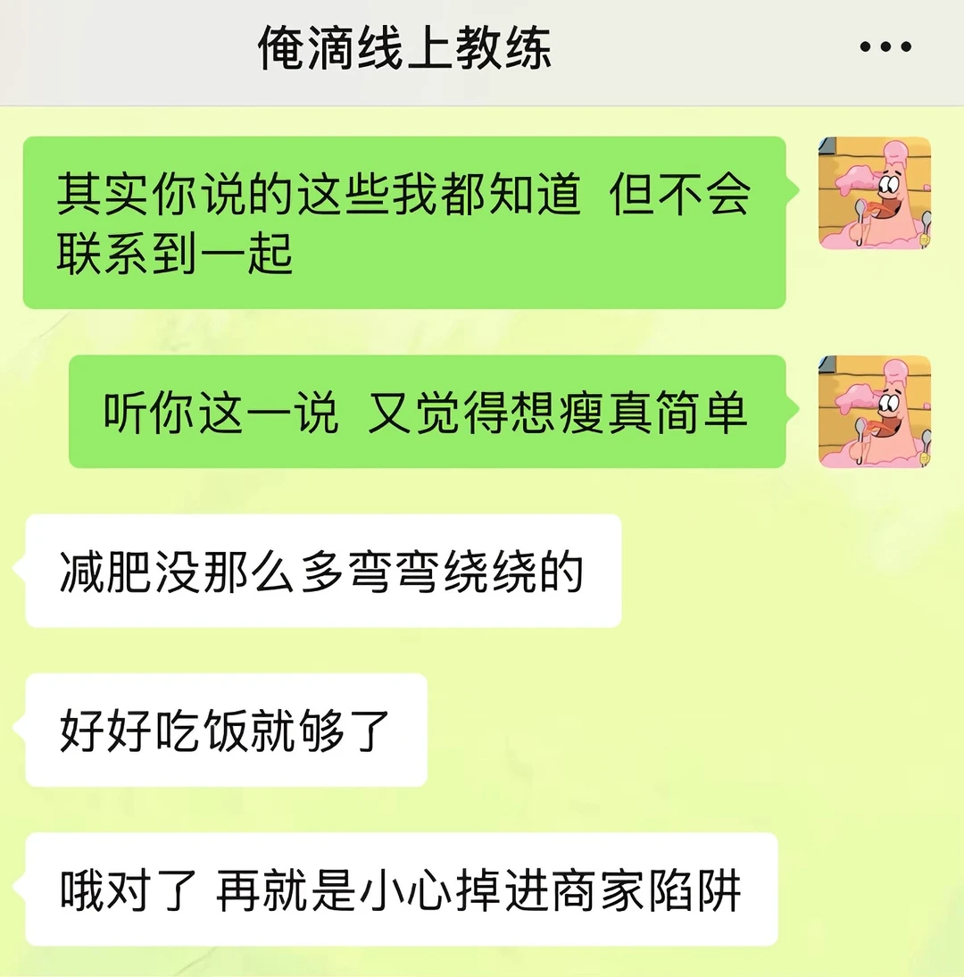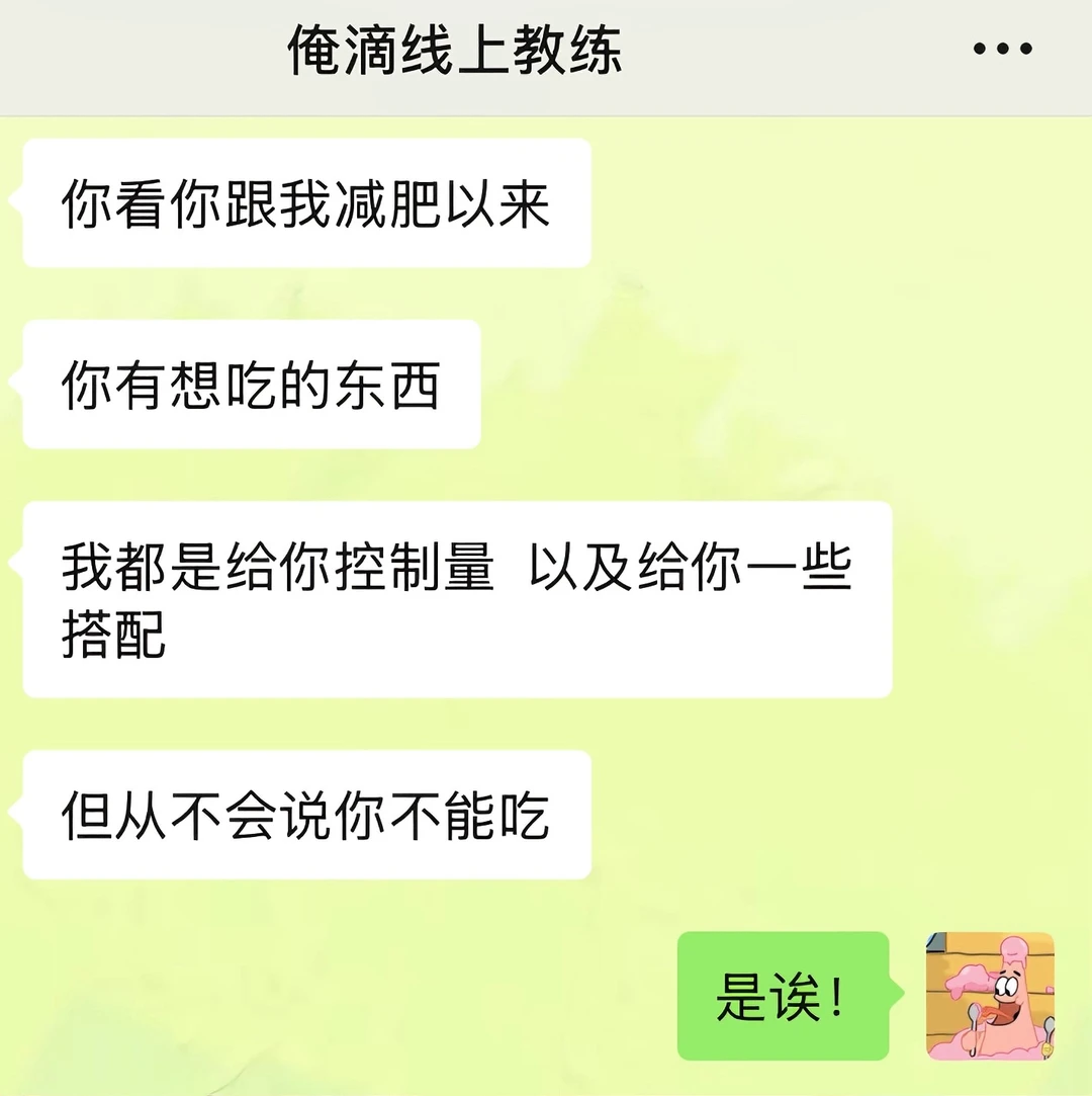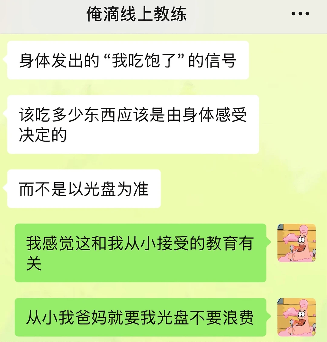 我之前吃饭一直都是狼吞虎咽型的,感觉大口吃饭很爽,经常这口没咽下去,下一口又续上了 直到线上教练姐给我科普了“有意识地吃东西”这个概念 今天午餐的时候我试了下:两个菜一碗米饭,吃了20分钟,最后没吃完就感觉到饱了 回想起我之前进食状态,每次都狼吞虎咽的吃,甚至不到十分钟都能吃完一顿饭,吃完之后还能再吃点零食溜溜缝,然后就感觉到好撑,肚子好胀 现在我算是明白了,之前每一餐,因为吃太快,额外摄入太多多余的食物了 以后是得学着细嚼慢咽了!