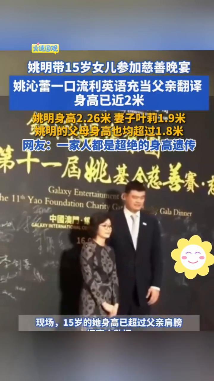 火速围观!姚明带15岁女儿参加慈善晚宴,姚沁蕾一口流利英语充当父亲翻译,身高已近2米。 姚明身高2.26米,妻子叶莉1.9米,姚明的父母身高也均超过1.8米。网友:一家人都是超绝的身高遗传。 12月16日据大河报报道,现场15岁的她身高已超过父亲肩膀。 喜欢就点个关注吧!
